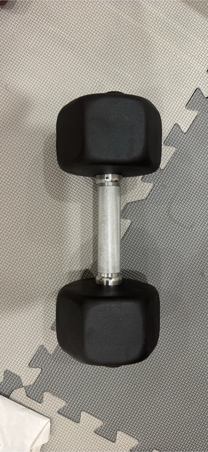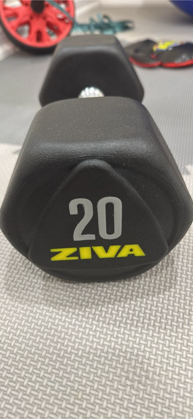 This is a ZIVA 20lb dumbbell. It has a rubber-coated hex head and a knurled chrome handle for a secure grip. Adds a good workout to any gym routine!