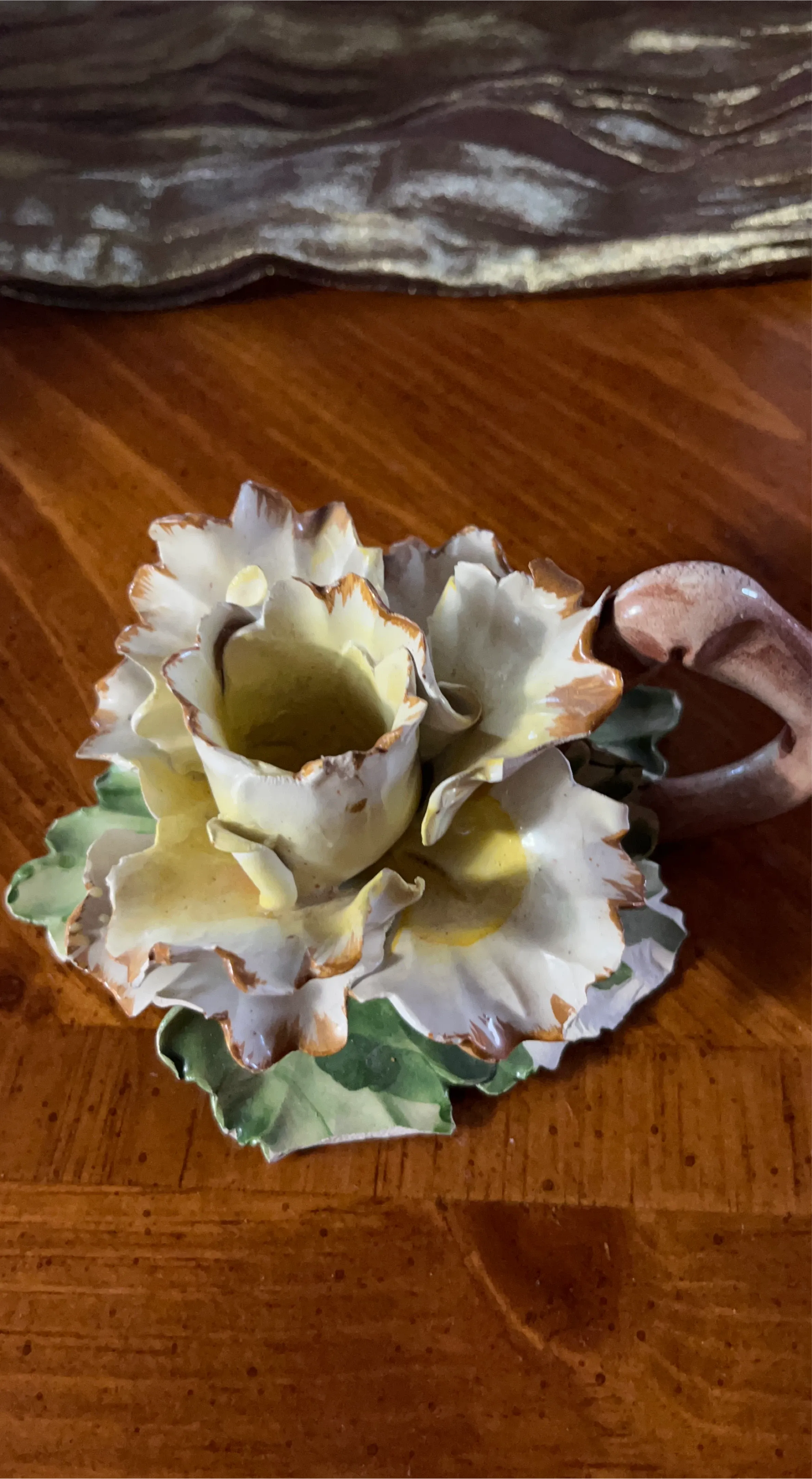 This is a decorative ceramic candle holder shaped like a flower. It has a handle and appears to be made of glazed ceramic. The colors are primarily off-white with brown accents on the petals and green leaves.