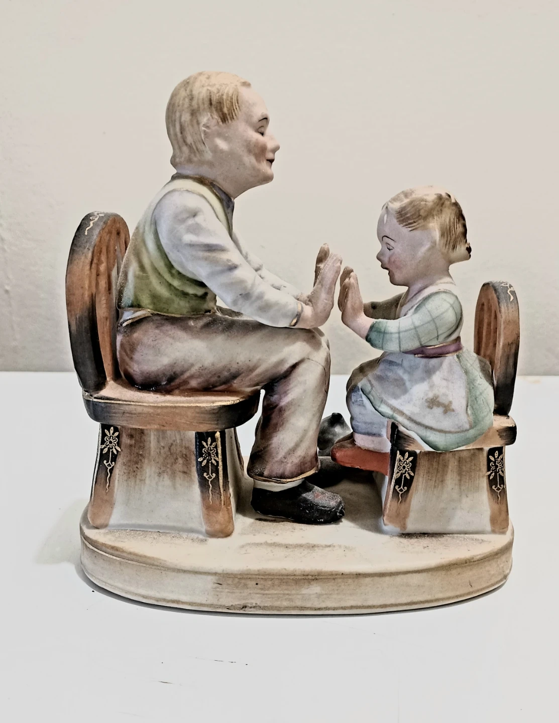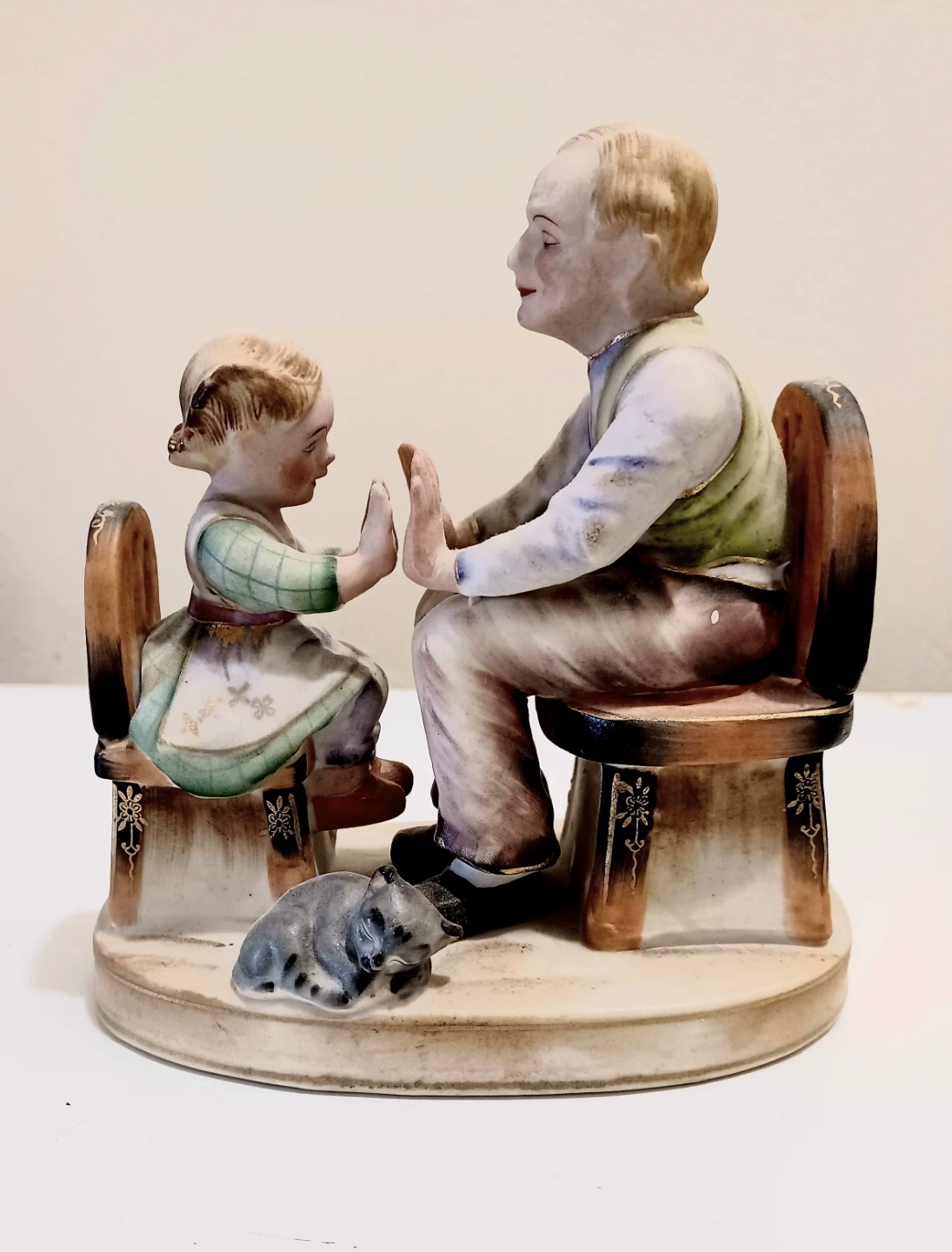 Stafford China figurine depicting an elderly man and a young girl playing patty cake, with a cat watching nearby. The figurine is hand-painted and in Very Good condition, showcasing intricate details and vibrant colours.