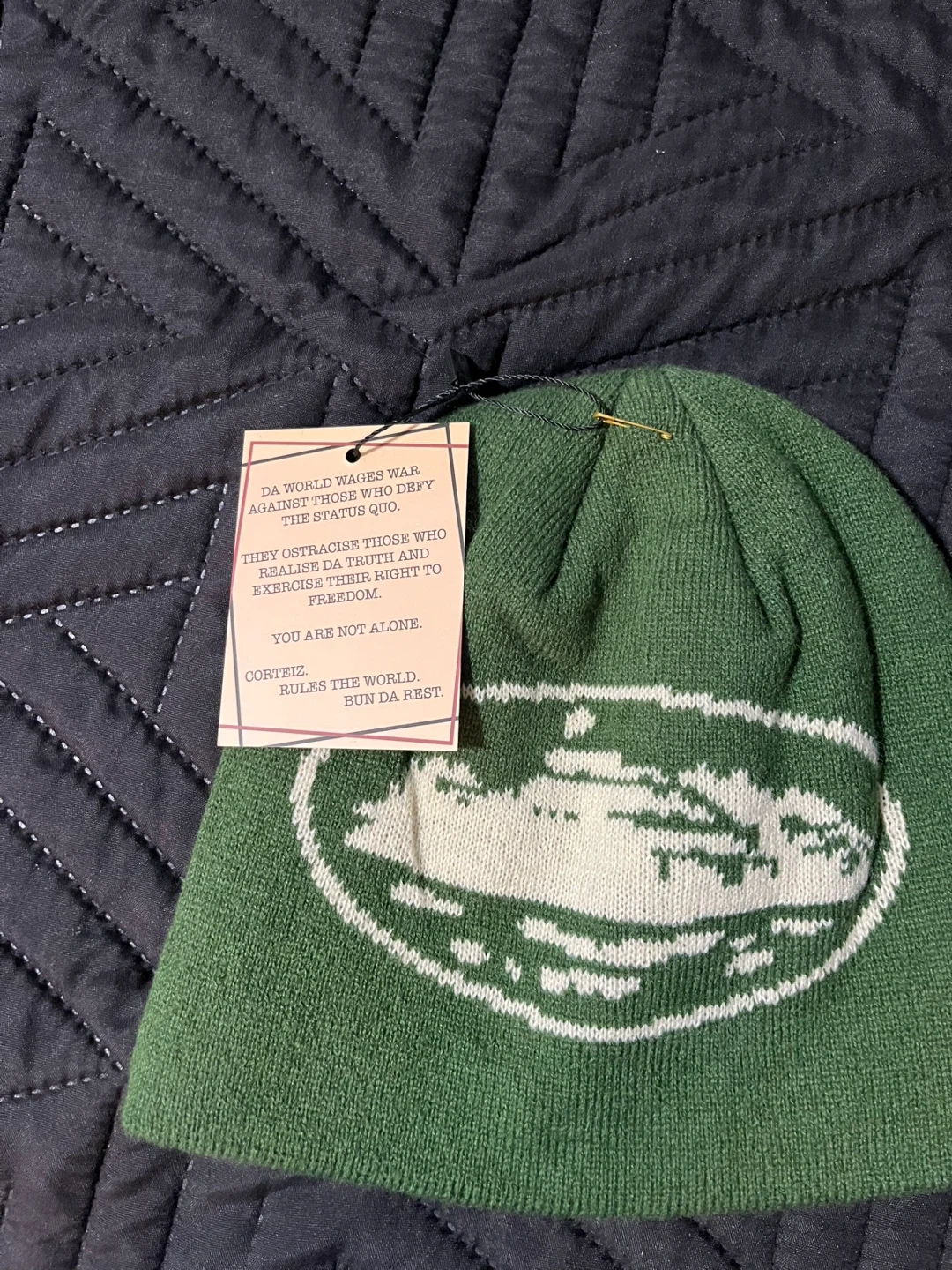 Green knitted beanie with the Corteiz logo on the front. One size fits all. Made from a comfortable material. It's perfect for keeping warm during colder months.
