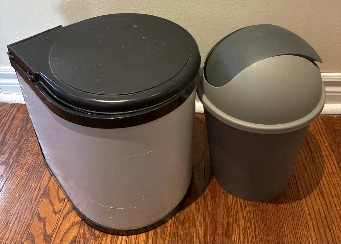 One white and black metal trash can with a flip-top lid. Beside it is a smaller dark grey plastic trash can with a swing-top lid. Both are in good condition.