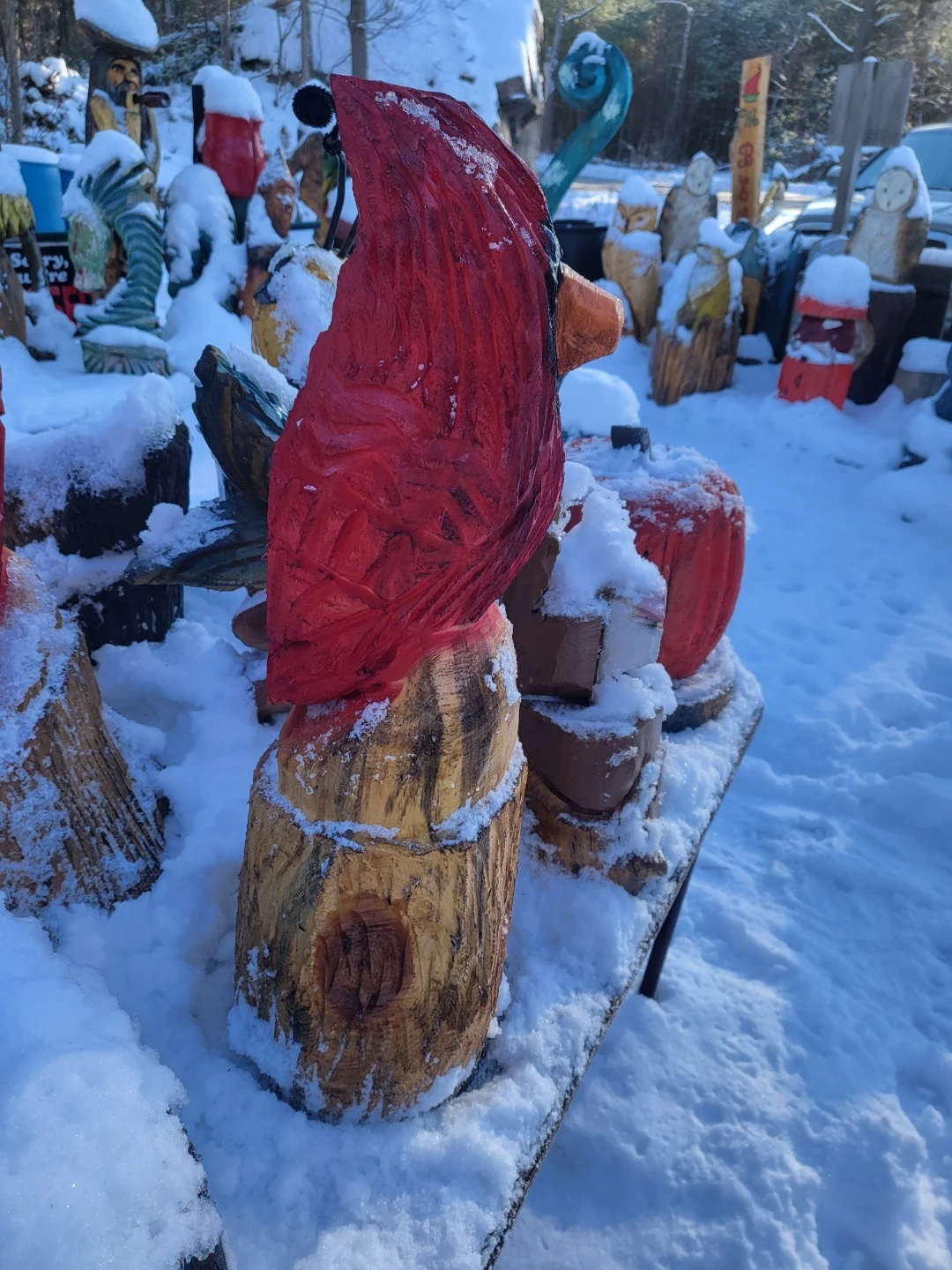 This chainsaw carving cardinal. It's painted bright red with a black and orange beak and black eyes. The base is a natural wood log. This unique piece would add a splash of colour to any garden or home decor!