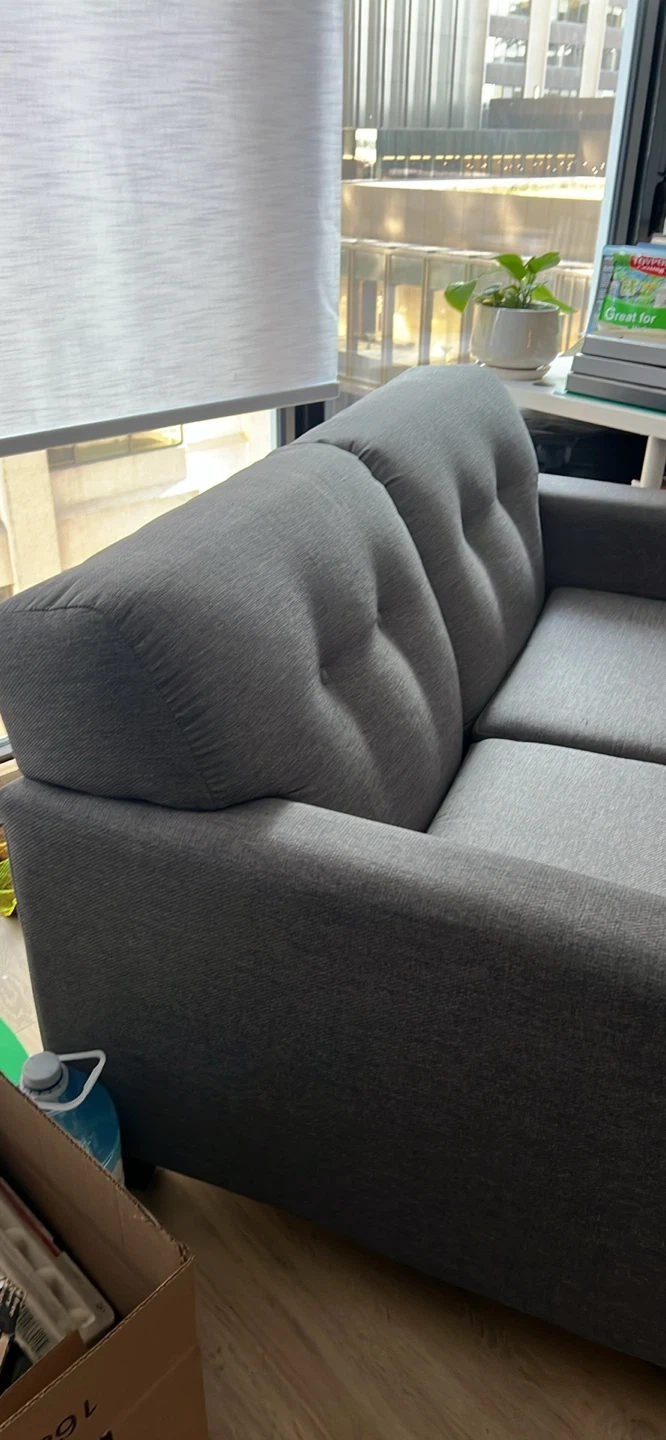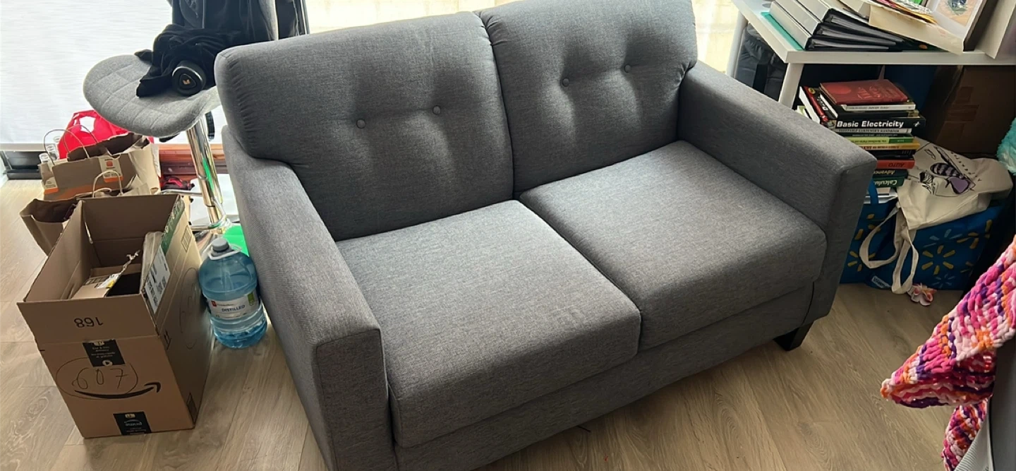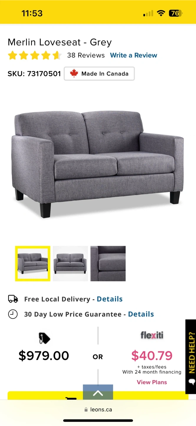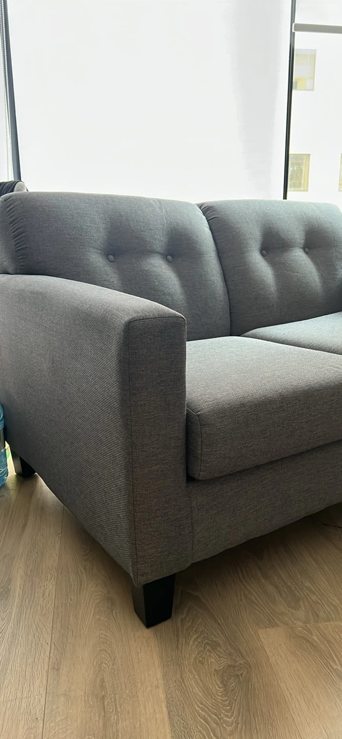 Selling a grey Merlin loveseat! It's in great shape and would be perfect for a smaller space. It's made in Canada and was originally bought for $979. It has a classic design that would look great in any home.