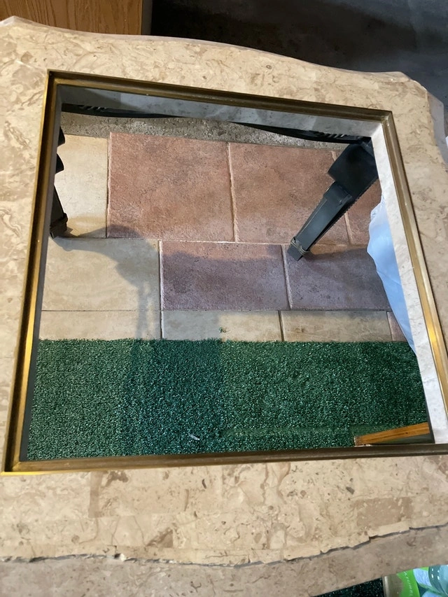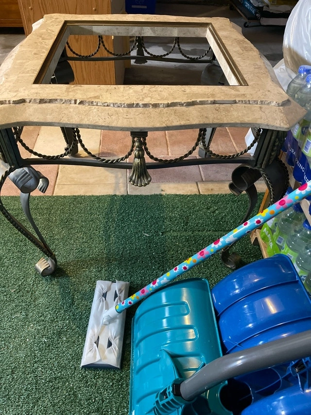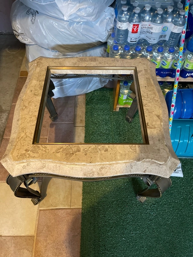 Add a touch of elegance to your living space with this eye-catching coffee table. This stylish table is in used condition, featuring a sturdy construction and a sophisticated design. It has a marble-like top and ornate metal legs. Please note, it is missing the glass insert for the middle section.