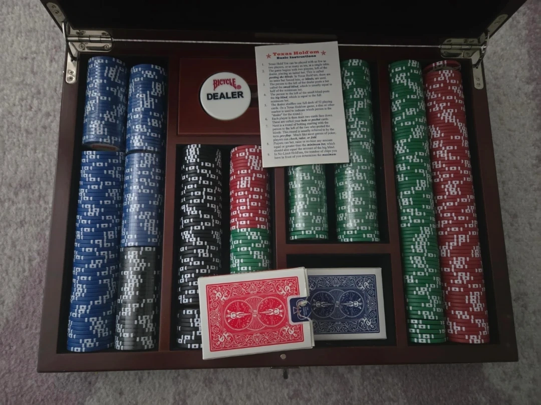 Selling a 500pcs Bicycle Texas Hold'em poker set, complete with a stylish case. It includes everything you need for a great poker night with friends and family. The set comes with poker chips and 2 packs of playing cards, all neatly organized in the included box!