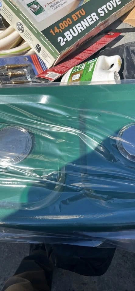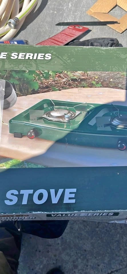 New 2-burner camping stove with 14,000 total BTU output. Features green steel construction with two adjustable 7,000 BTU burners. Includes an easy-to-clean drip tray and uses standard 16.4 oz propane cylinders.