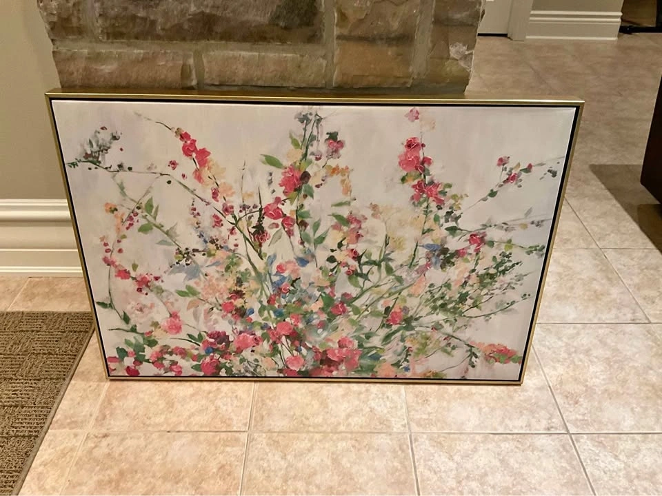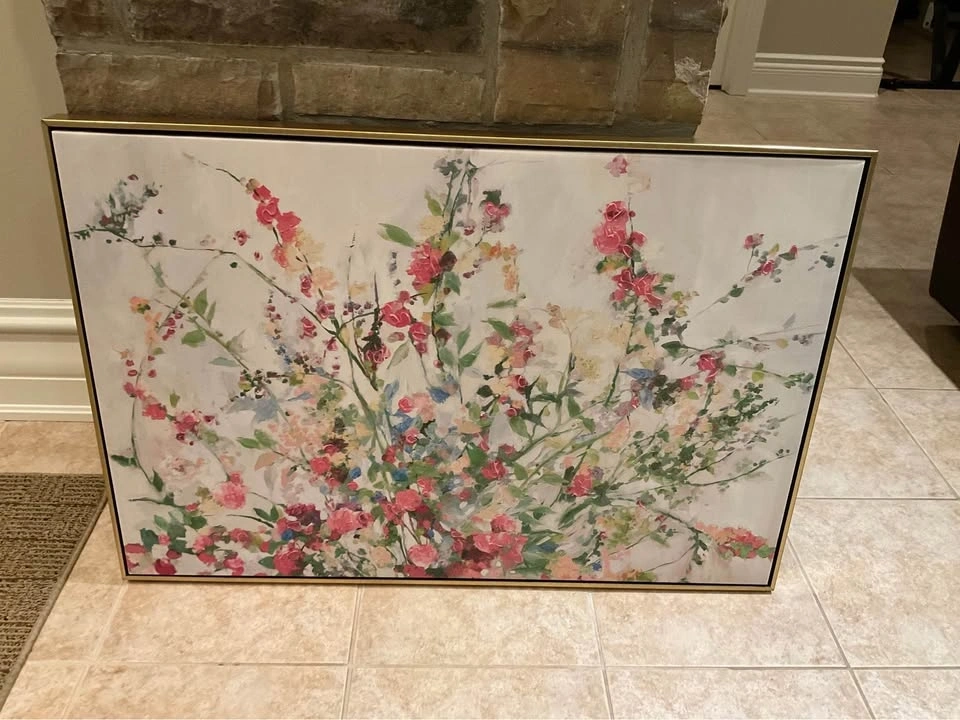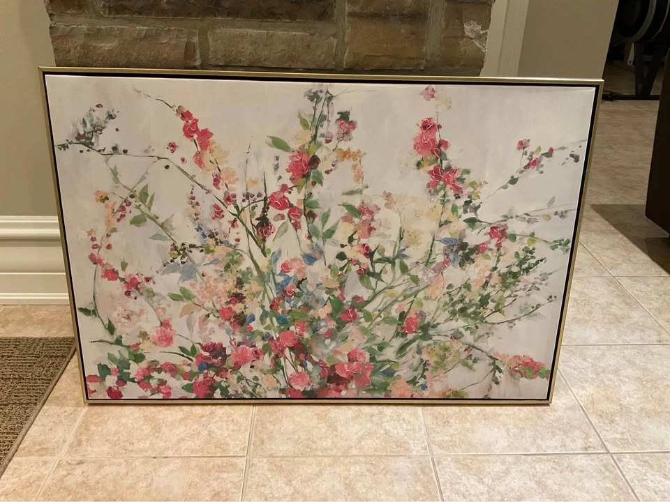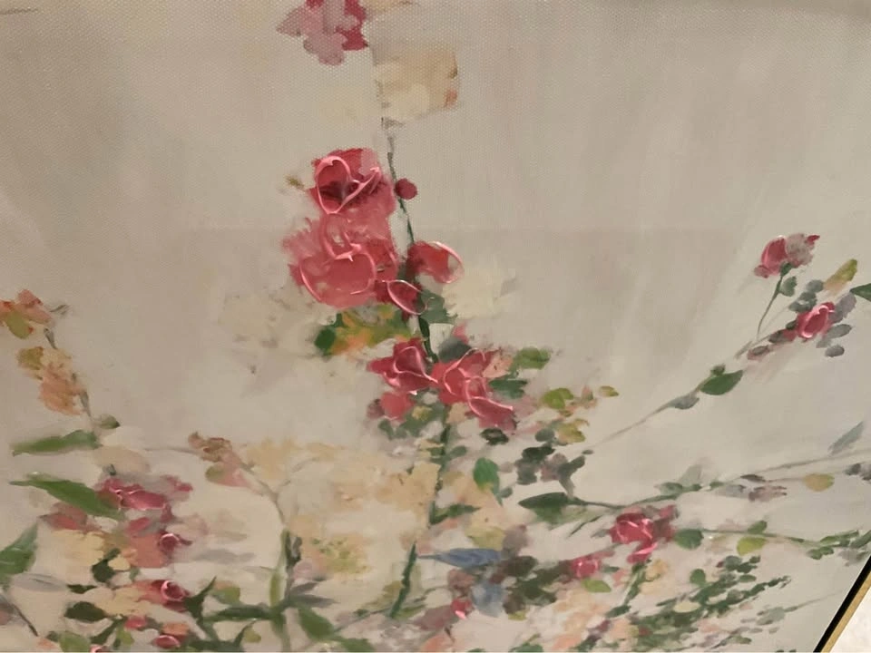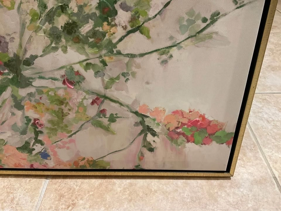 Stunning bright floral print on canvas with raised oil brush strokes. Beautiful gold frame. Pristine condition. 37" x 25". Smoke & pet free home. Cash only - Richmond Hill (Bathurst & King Rd).
