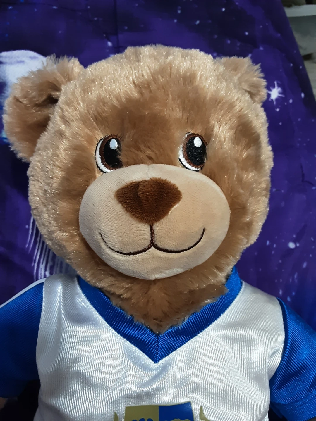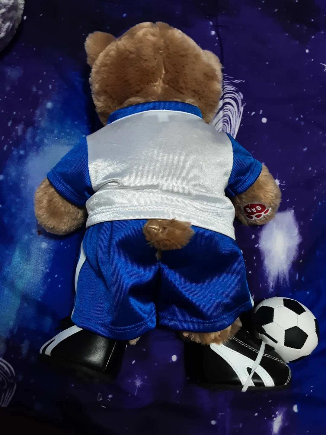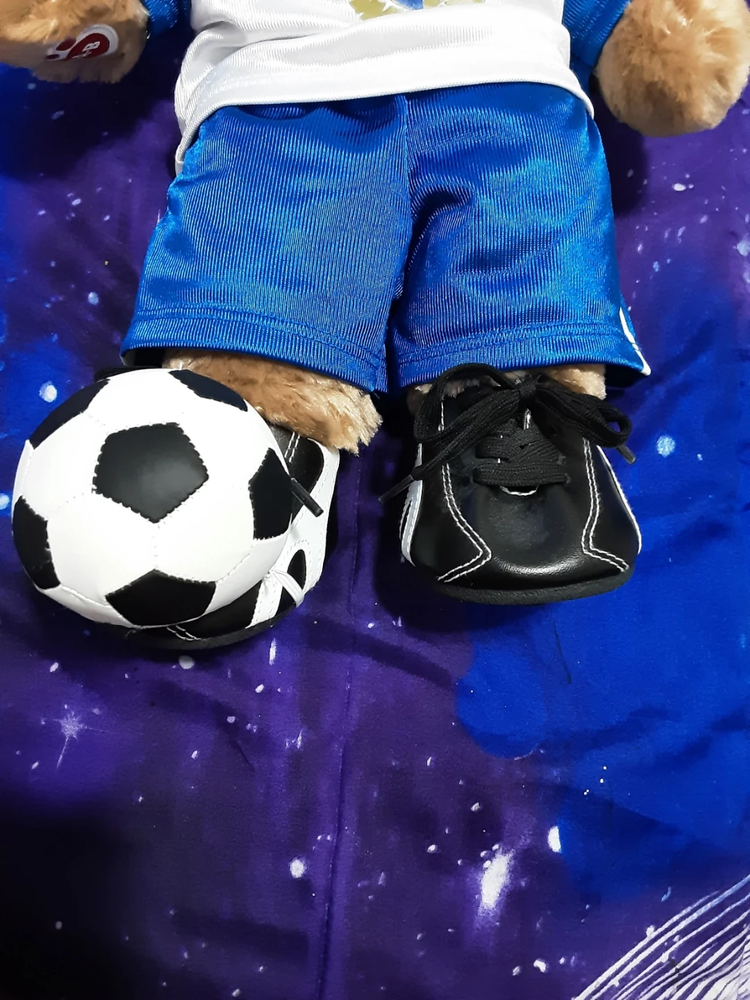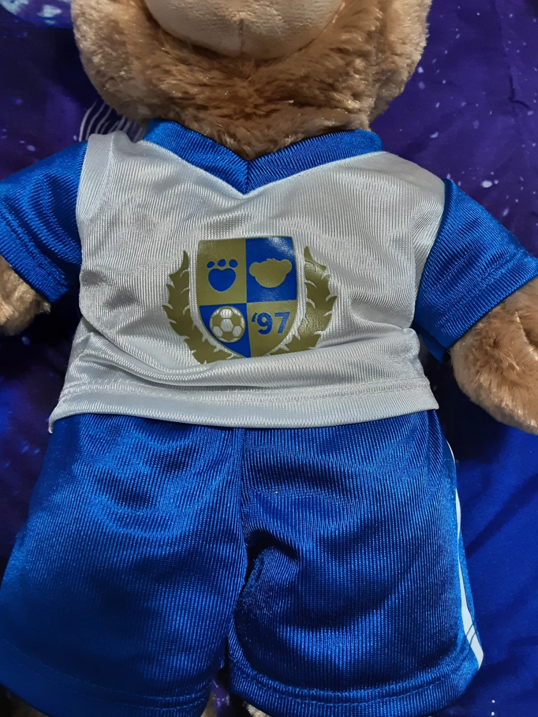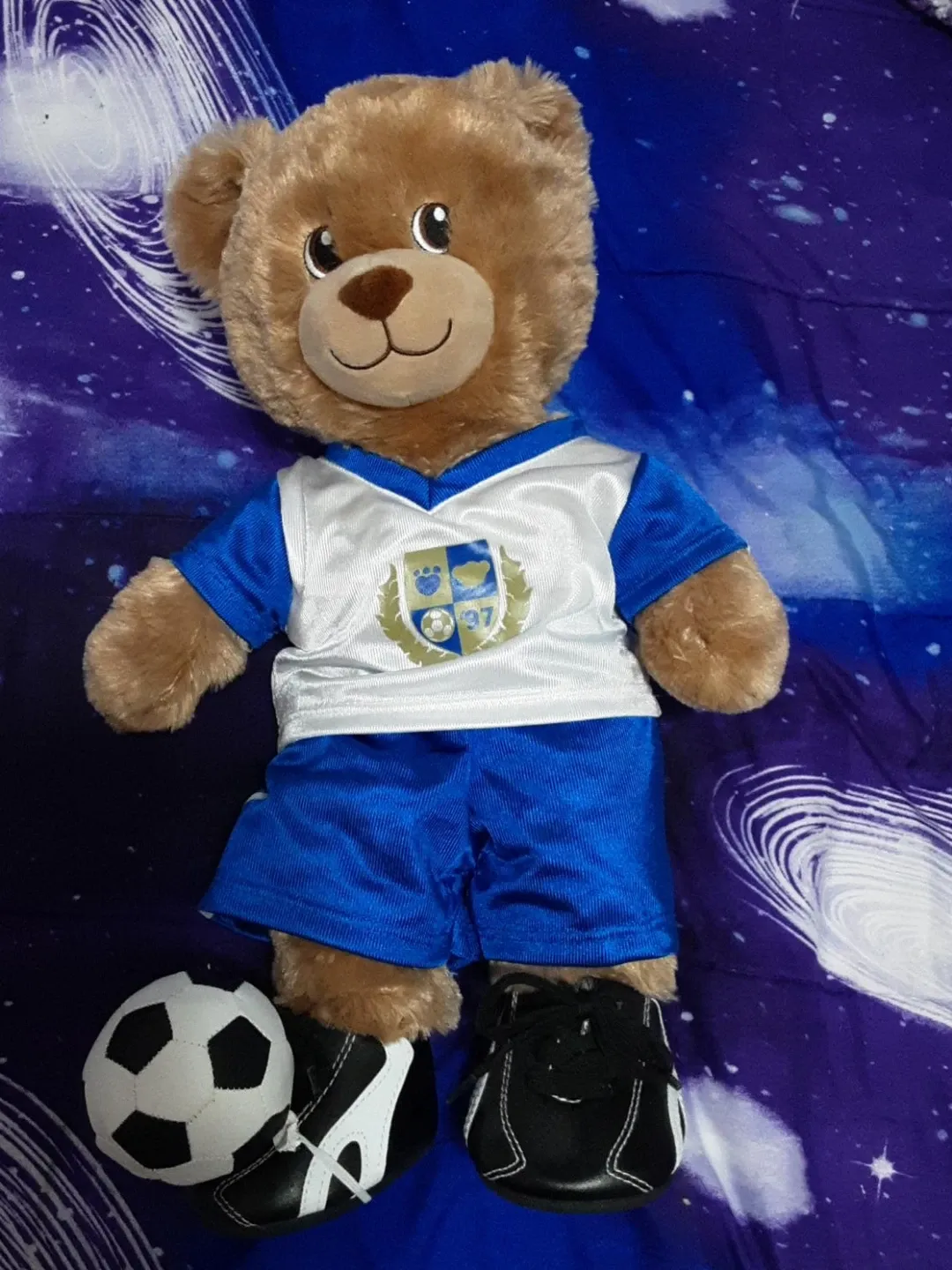 This is a plush teddy bear from Build-A-Bear, dressed in a soccer uniform. It comes with a mini soccer ball and tiny sneakers. The uniform features a crest with '97' on it. It's a great gift for soccer fans!