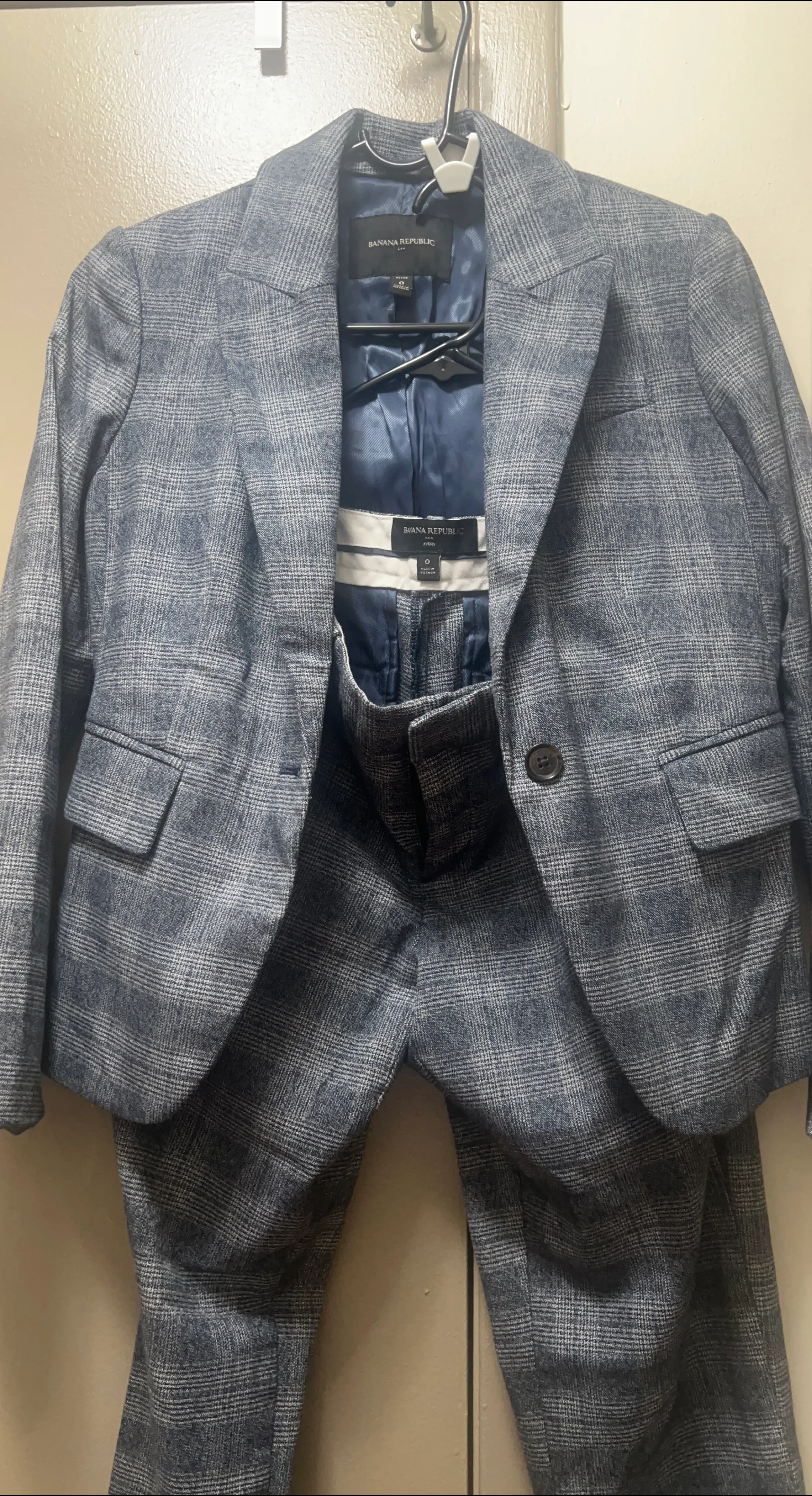 This is a Banana Republic suit set in size 0. It features a classic plaid pattern and a blue lining. The jacket and pants are included.
