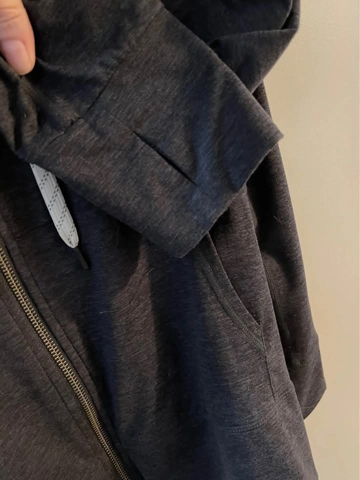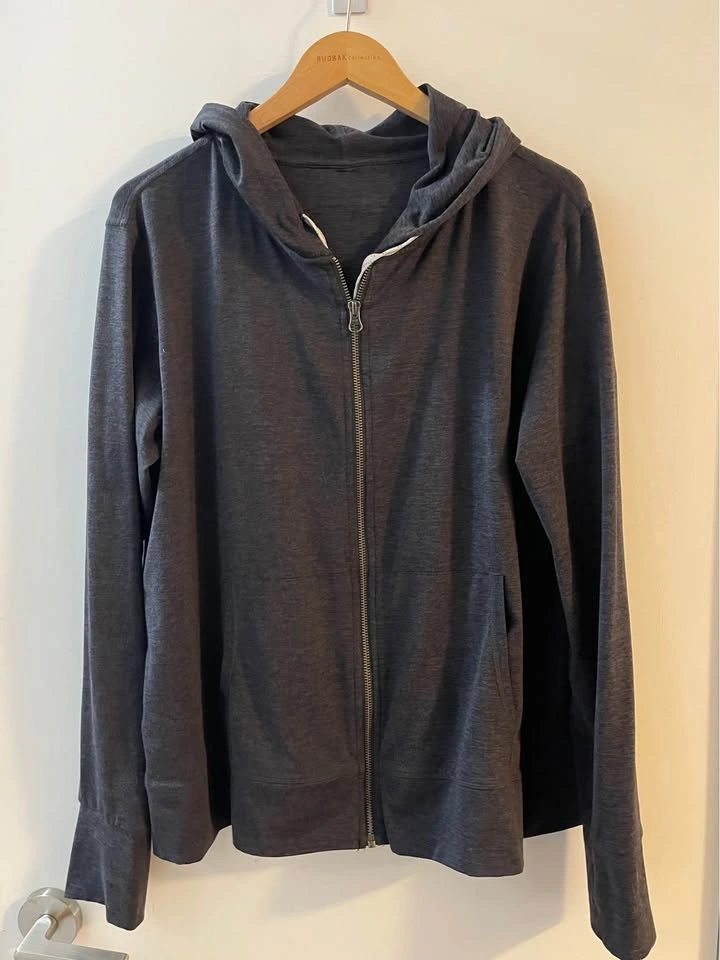 Kirkland Signature women’s lightweight full zip hoodie. Size Large, charcoal grey. Condition: like new. Worn once and laundered/stored. I did remove the tags because they irritate me. Features: Moisture wicking fabric, Front pockets, Adjustable drawcord, Machine washable. Colour: black, dark red or pink. Made in Lesotho. Fabric Content: 89% recycled polyester, 11% spandex. Size L: Front body length: 26 in. (66.04 cm), Chest circumference: 43.5 in. (110.49 cm), Sweep at hem: 44.5 in. (113.03 cm), Sleeve Length: 26.12 in. (66.35 cm).