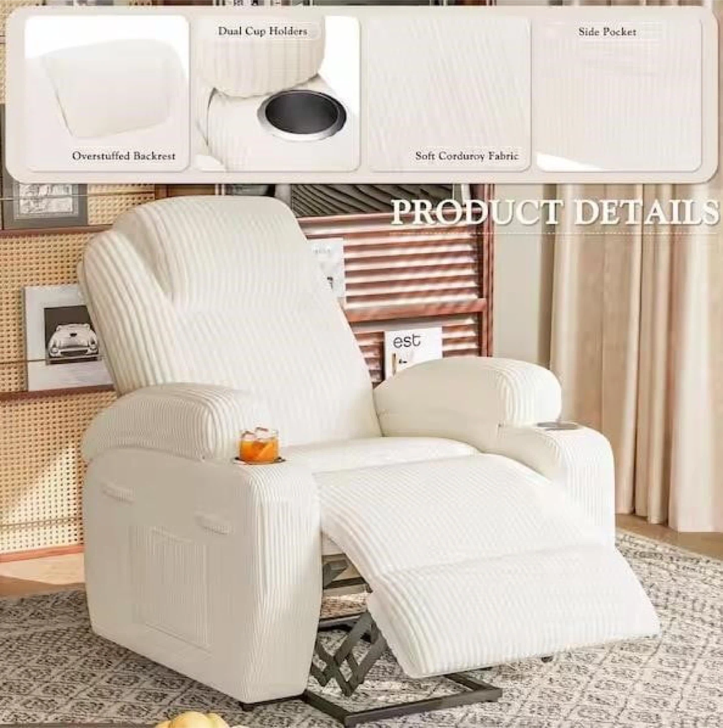 This comfy recliner chair is perfect for relaxing at home! It features: