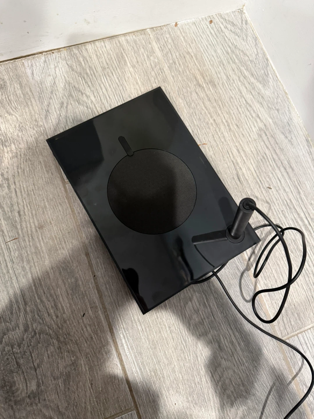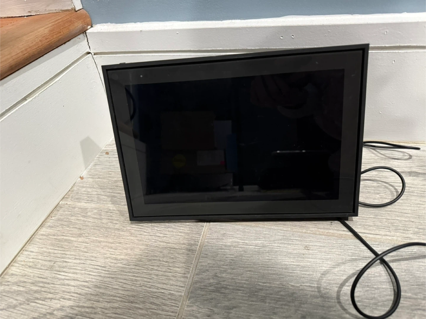 This is a black digital photo frame. It's a sleek way to display your favorite pictures. The frame has a cord for power.