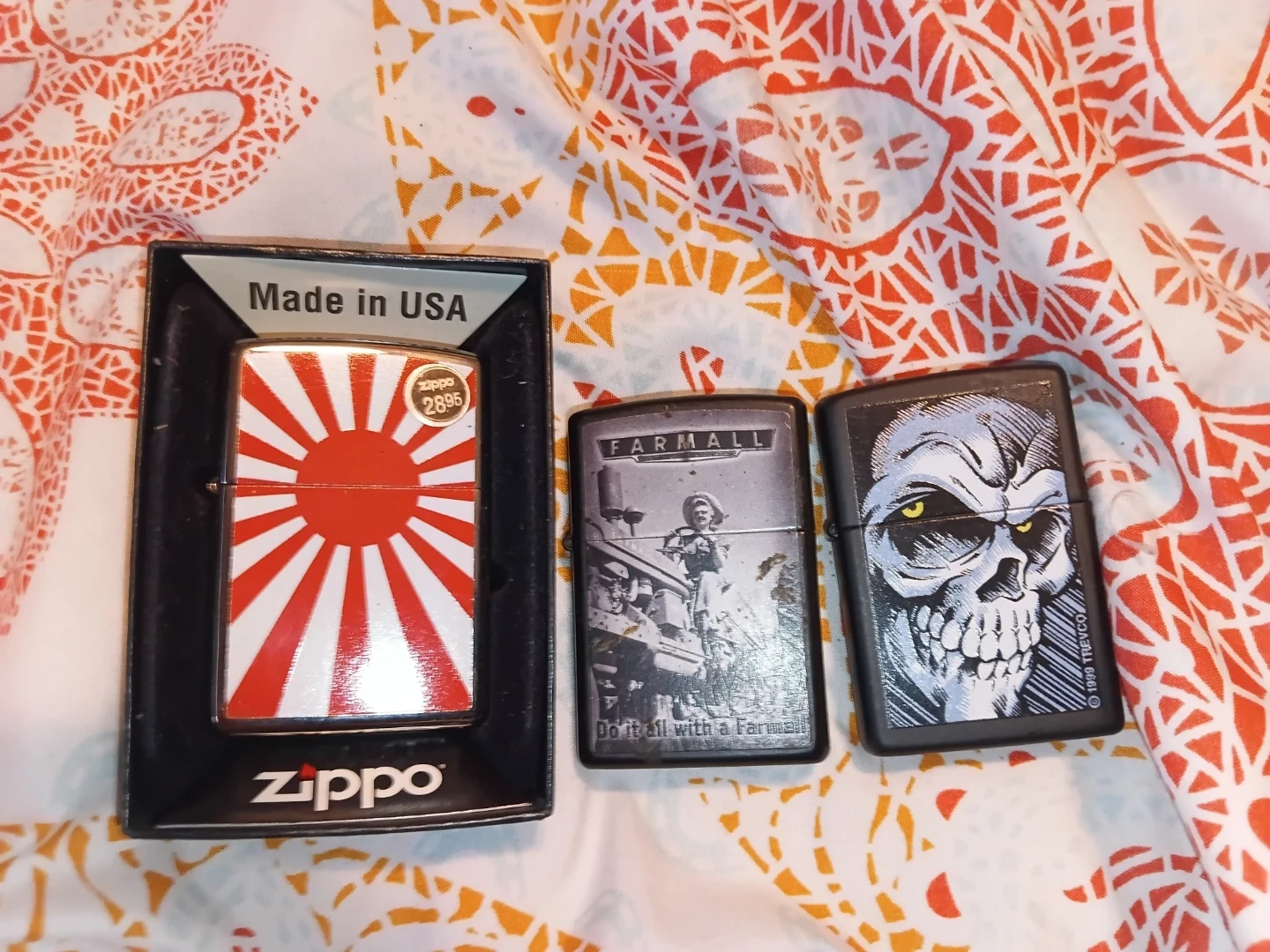 Selling a lot of three Zippo lighters. One features a classic rising sun design and comes in its original packaging. Another has a Farmall tractor design with "Do it all with a Farmall" text. The third lighter has a striking skull graphic and is dated 1999. These are great collectible items for lighter enthusiasts or fans of these designs.