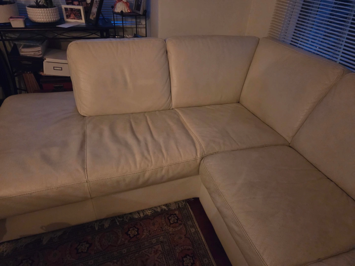Comfortable sectional sofa upholstered in cream-coloured leather. It's a great piece for a living room or den! Seats multiple people comfortably.