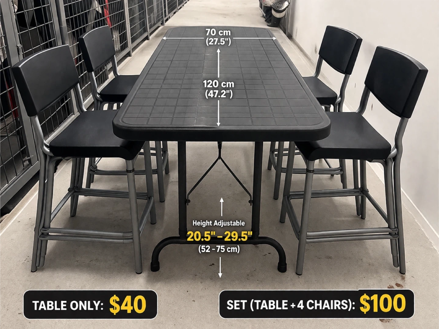 This is an adjustable height folding table, measuring 48 inches by 24 inches. It's black and the height is adjustable from 20.5 to 29.5 inches. It's great for various uses and folds for easy storage!