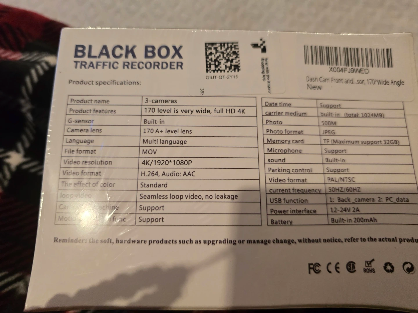 This is a 3-channel traffic recorder with full HD 4K video. It features a 170-degree wide-angle lens and supports motion detection and parking control. The device uses MOV file format and records in 4K/1920*1080P. This is a brand new product, sealed with manufacturers seal. Unopened. It includes a 32 gb sd card aswell. $125.00 only. Thanks.