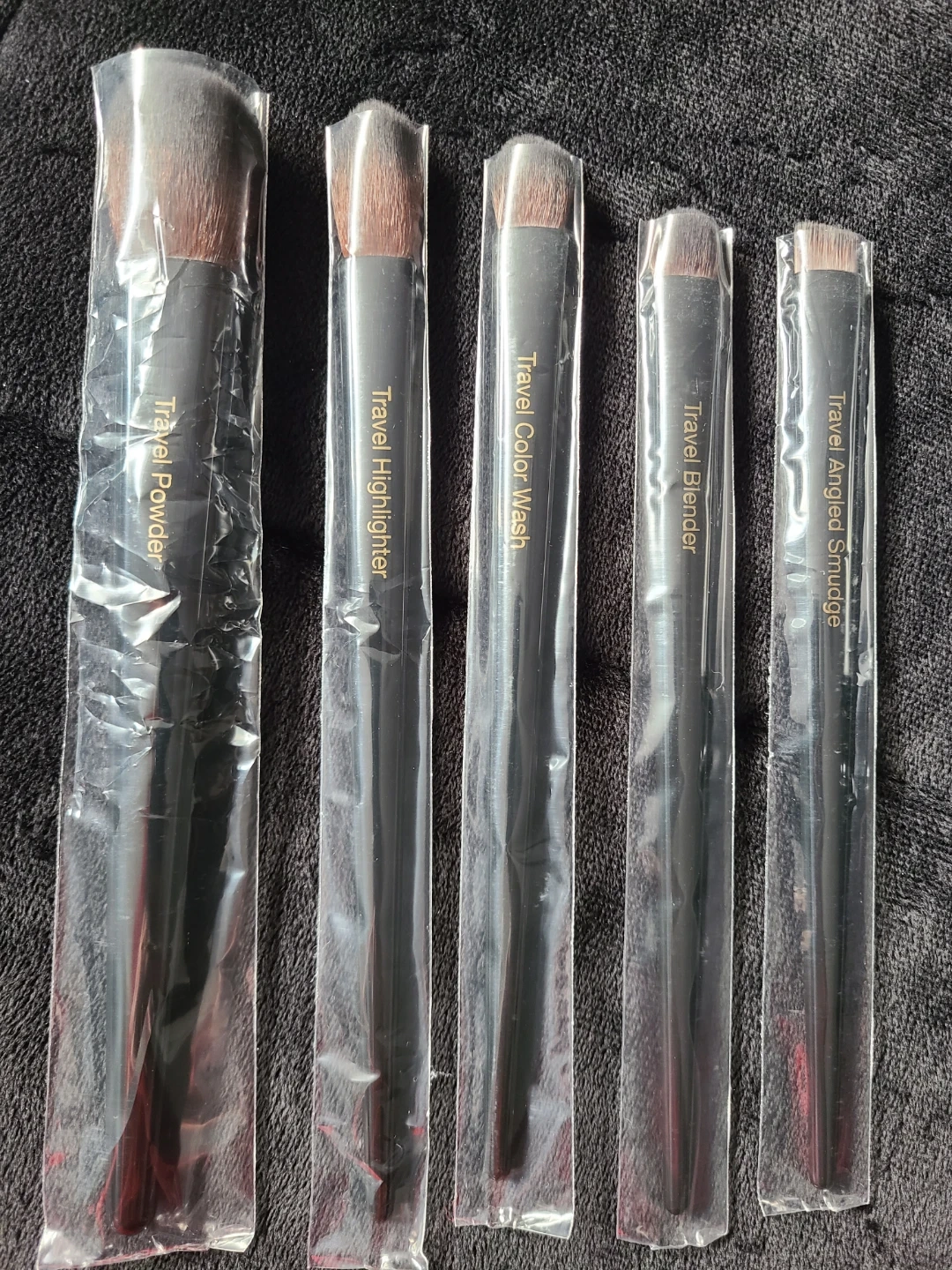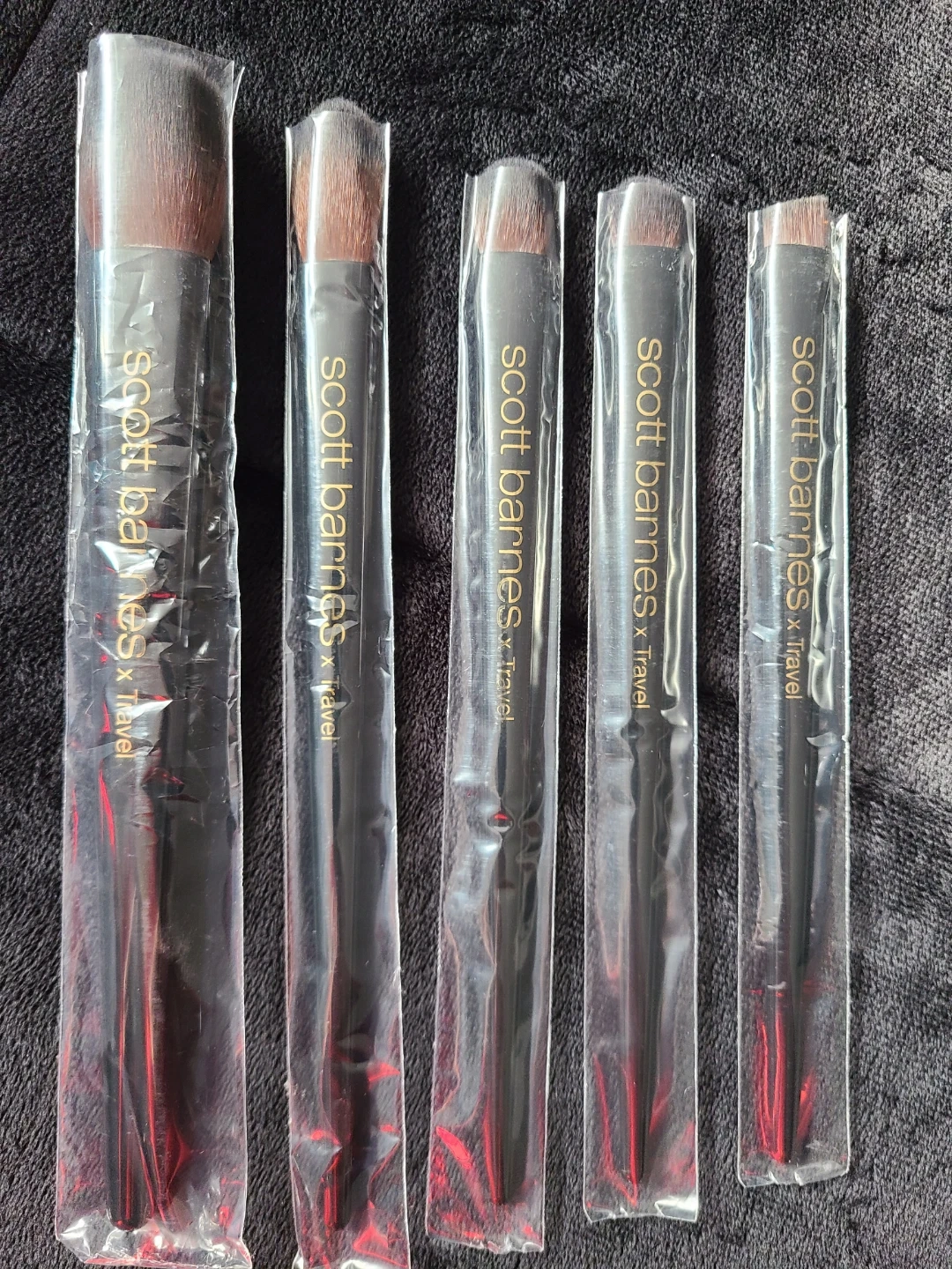Scott Barnes X Travel brush set. Includes Travel Powder, Travel Highlighter, Travel Color Wash, Travel Blender, and Travel Angled Smudge brushes.