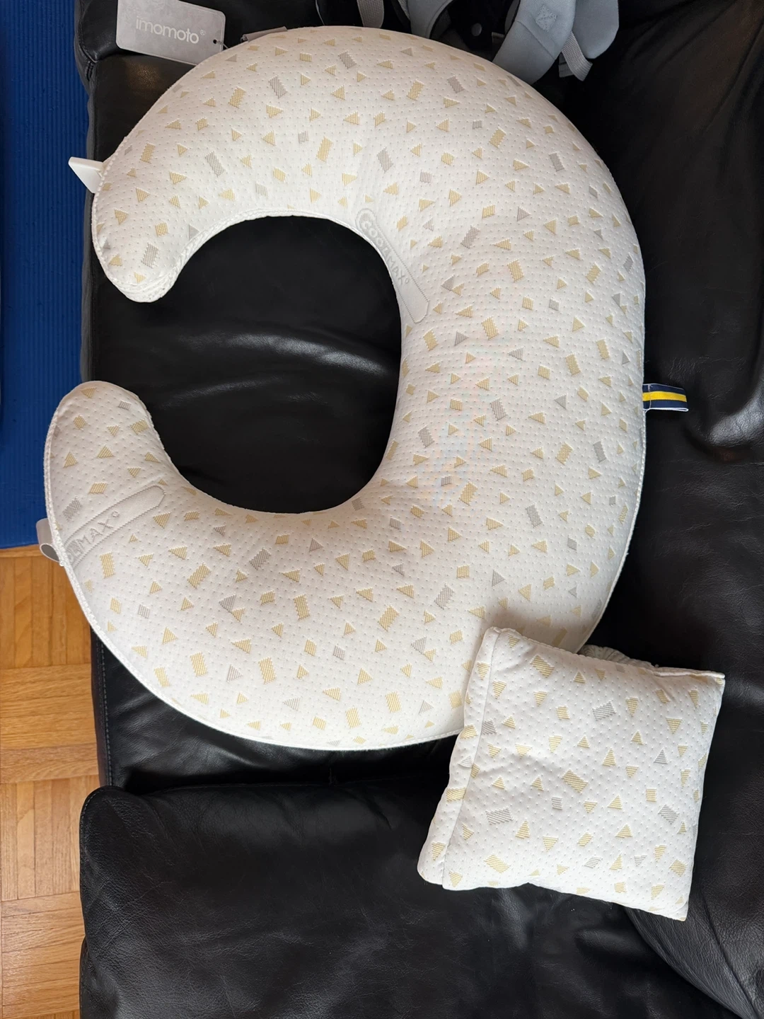 This nursing pillow comes with a smaller coordinating pillow. It's designed to support you and your baby during feeding. The cover features a geometric triangle pattern in white, yellow, and grey.