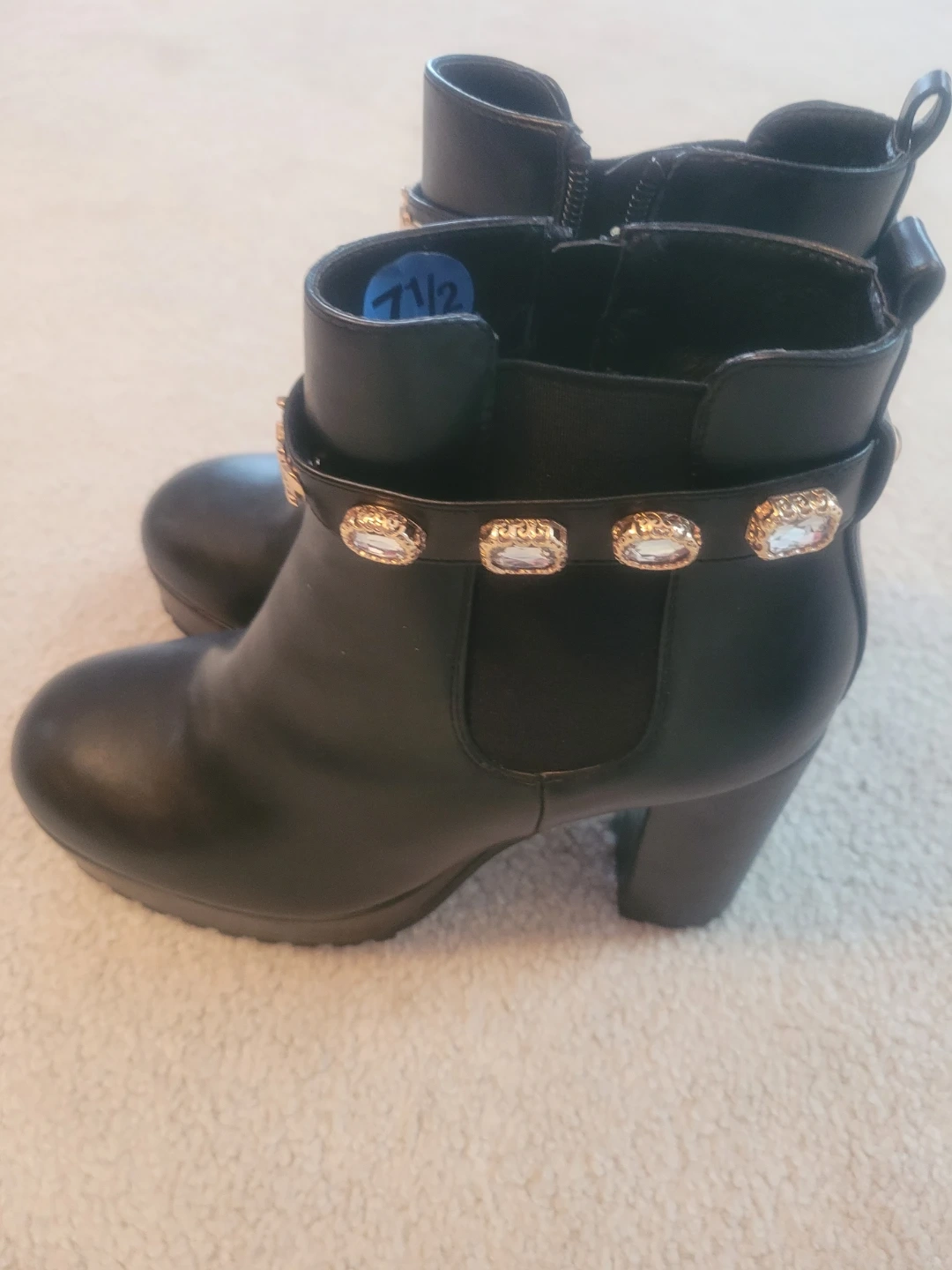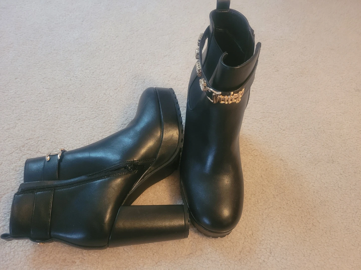 Black faux leather ankle boots featuring a decorative gold chain and crystal embellishment around the ankle. Side zipper closure with elastic gore for easy wear. Chunky block heel and platform sole.