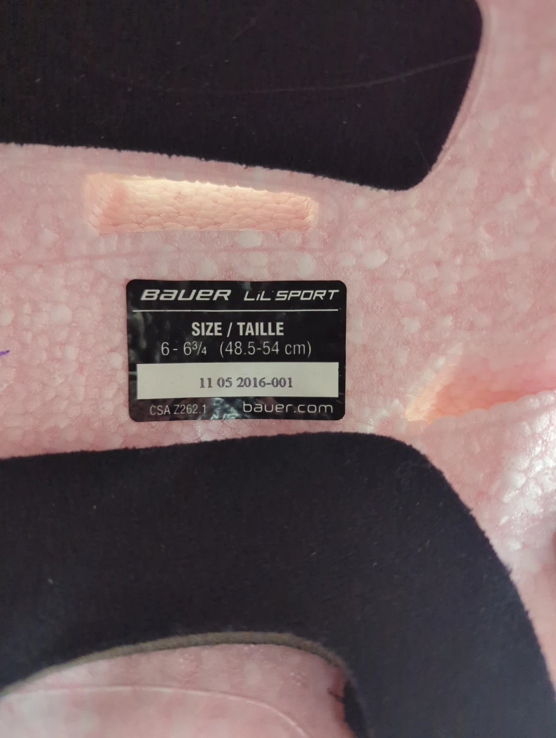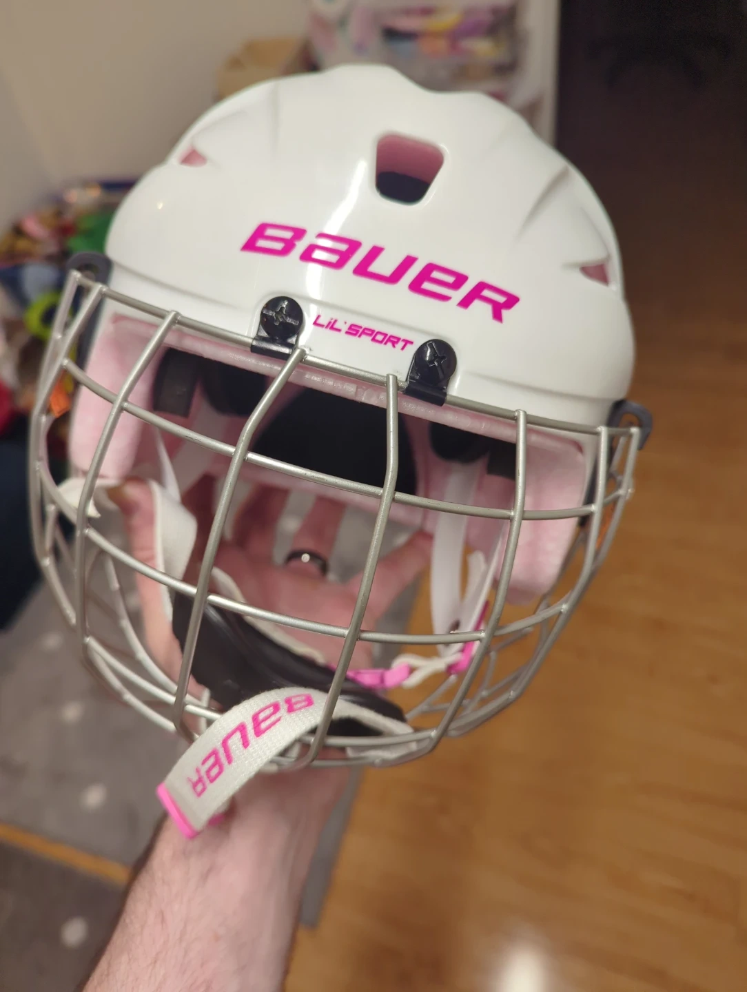 Bauer Lil' Sport youth hockey helmet in white with pink accents. Size is 6-6¾ (48.5-54 cm). Certified hockey helmet.
