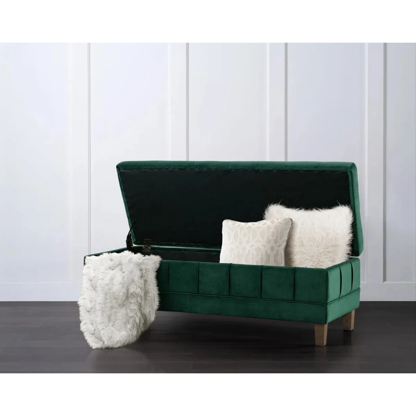 Moving out sale - Deep green velvet tufted storage bench with wooden legs. It's perfect for storing blankets, pillows, or other household items. The bench opens to reveal ample storage space inside.