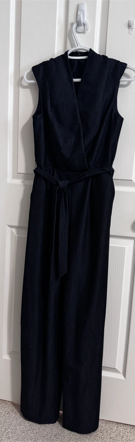 This dark blue jumpsuit features a wrap-style V-neck and a tie belt at the waist. It's sleeveless with a wide-leg silhouette. Made from a denim-like fabric, it offers a stylish yet comfortable option. Only wear once.