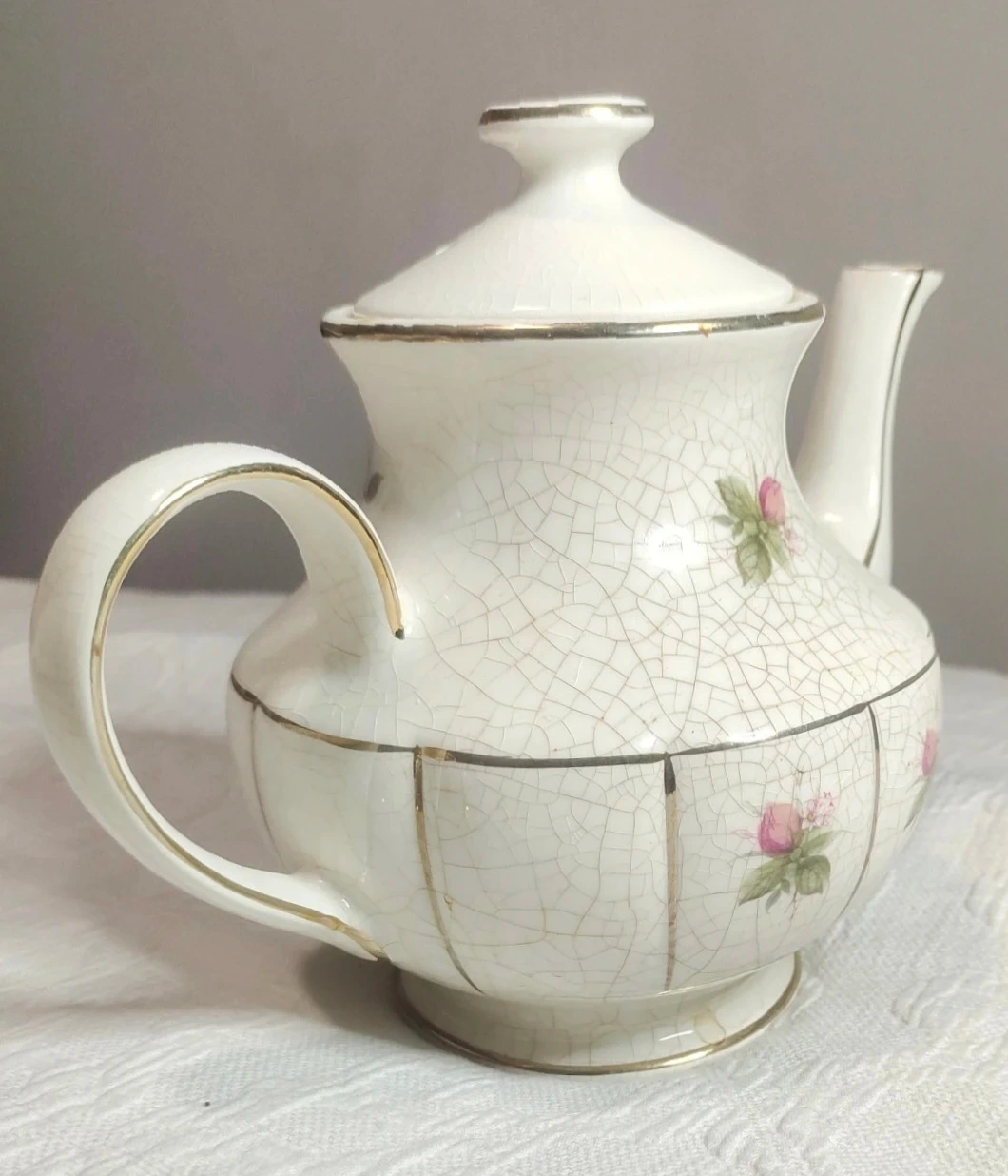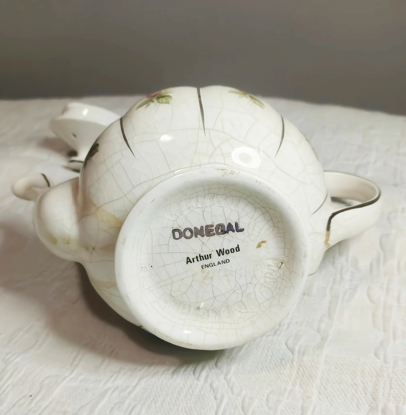 This is a vintage teapot from Arthur Wood, part of their Donegal line. It's white ceramic with delicate pink rose decals and gold trim accents. The teapot shows a fine crazing pattern across its surface, adding to its antique charm.