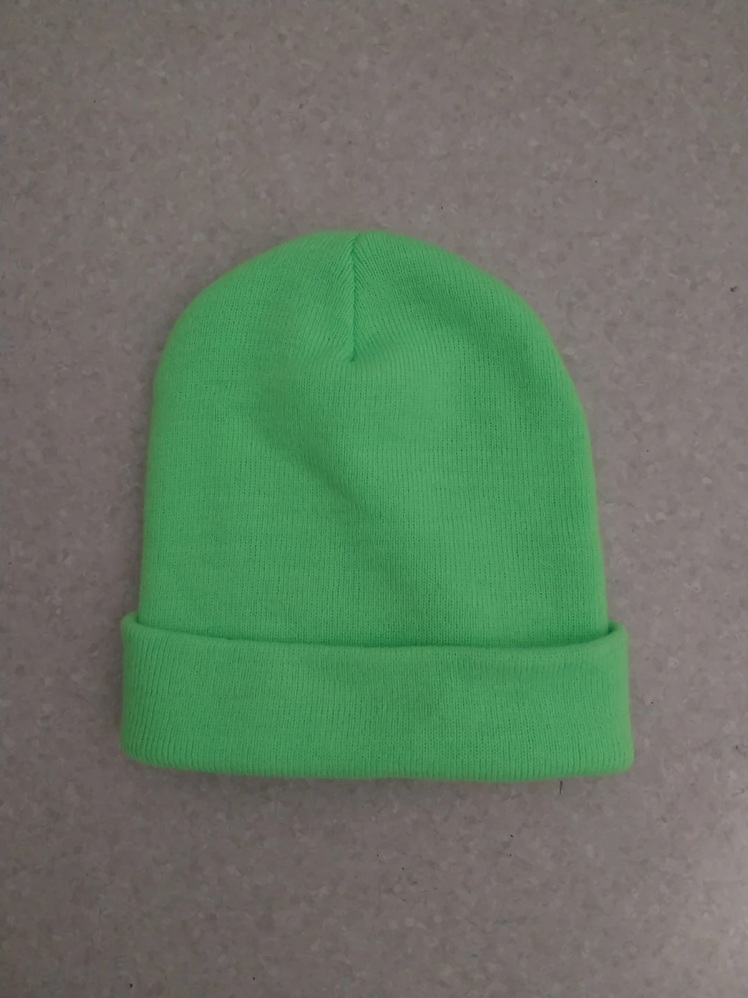 A comfy, bright green knit beanie. It's made of a soft, stretchy material. This hat is a one-size-fits-most style. It's perfect for staying warm on chilly days!