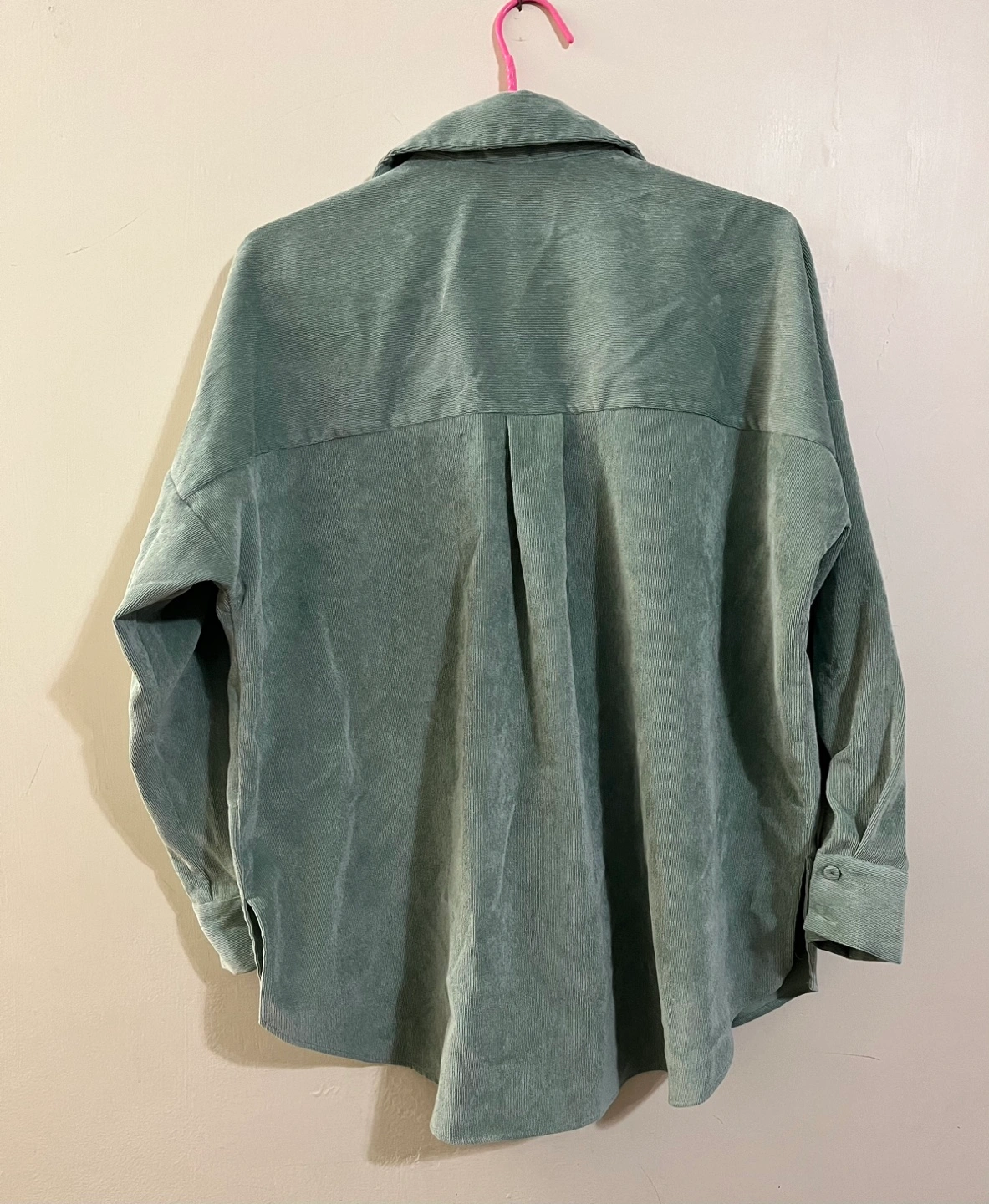 Green corduroy button up shirt. Long sleeves, collared, and has a pocket on the front.