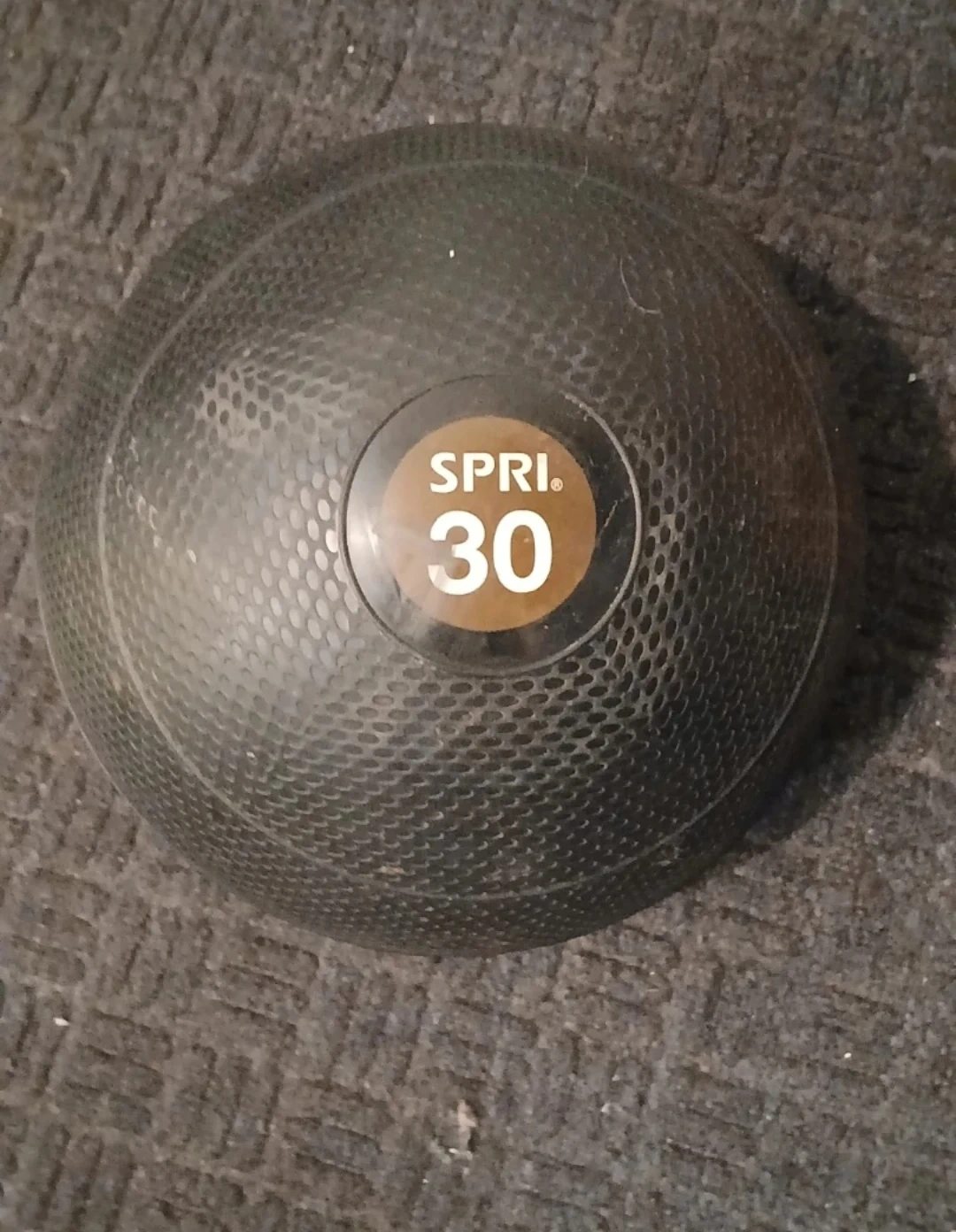 SPRI slam ball weighing 30 lbs. It's made from durable rubber with a textured surface for grip. This ball is great for conditioning and cross-training exercises.
