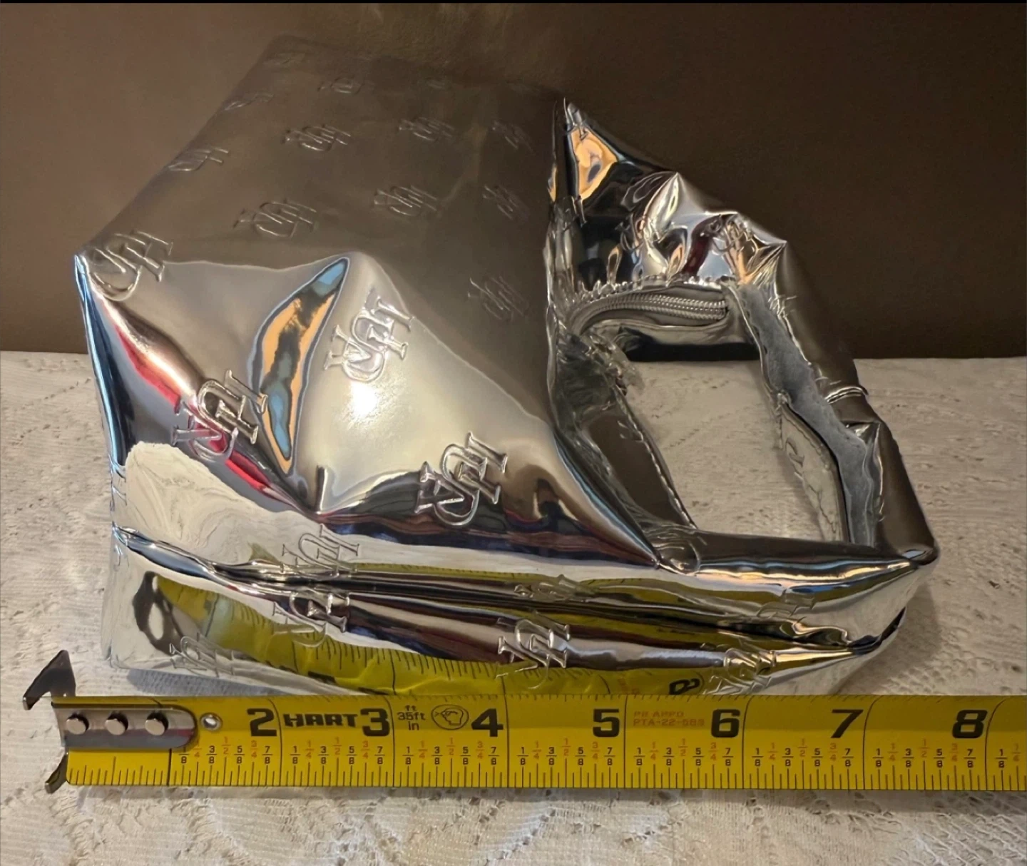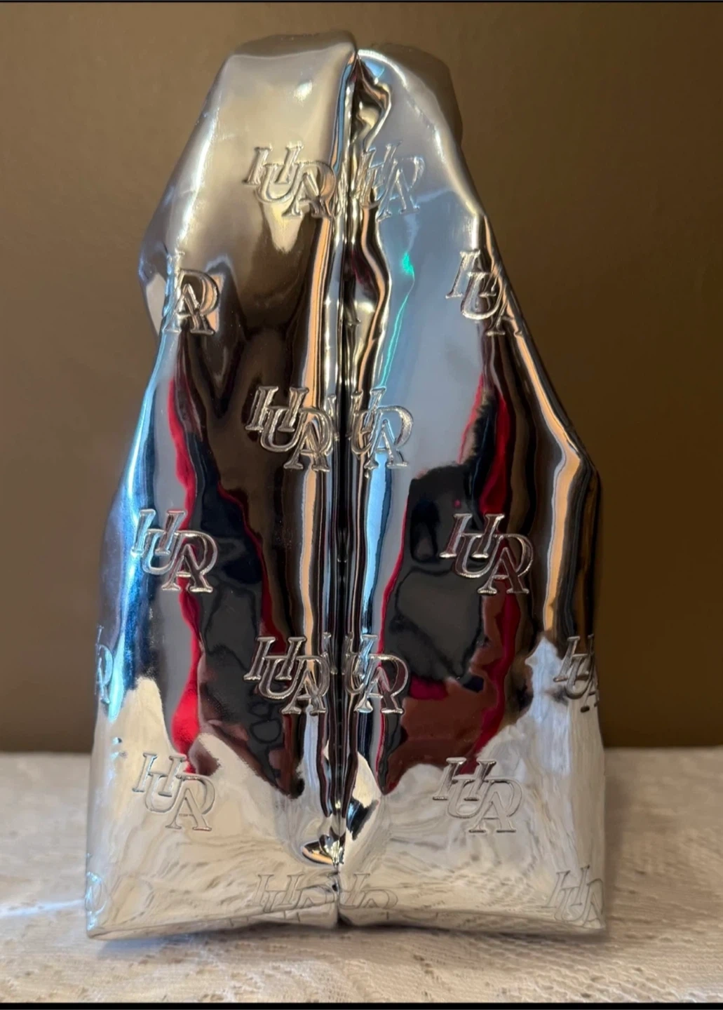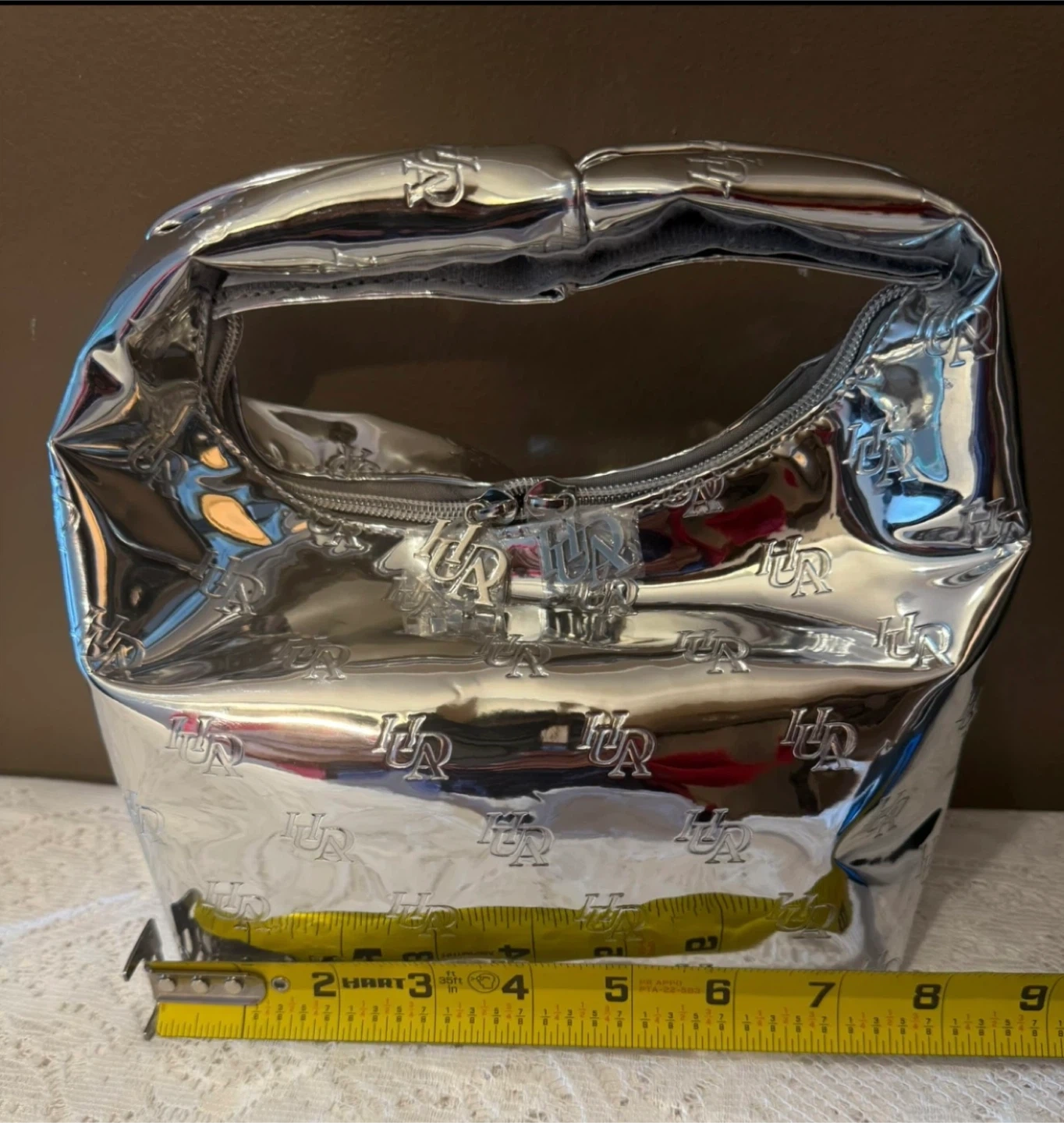 • Eye-catching metallic chrome silver with embossed "HB" monogram logo throughout.
