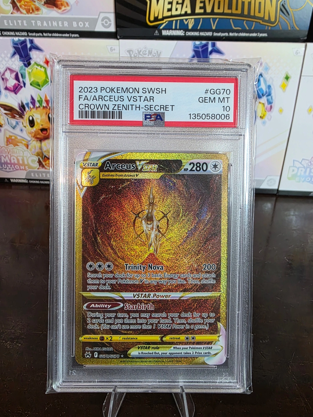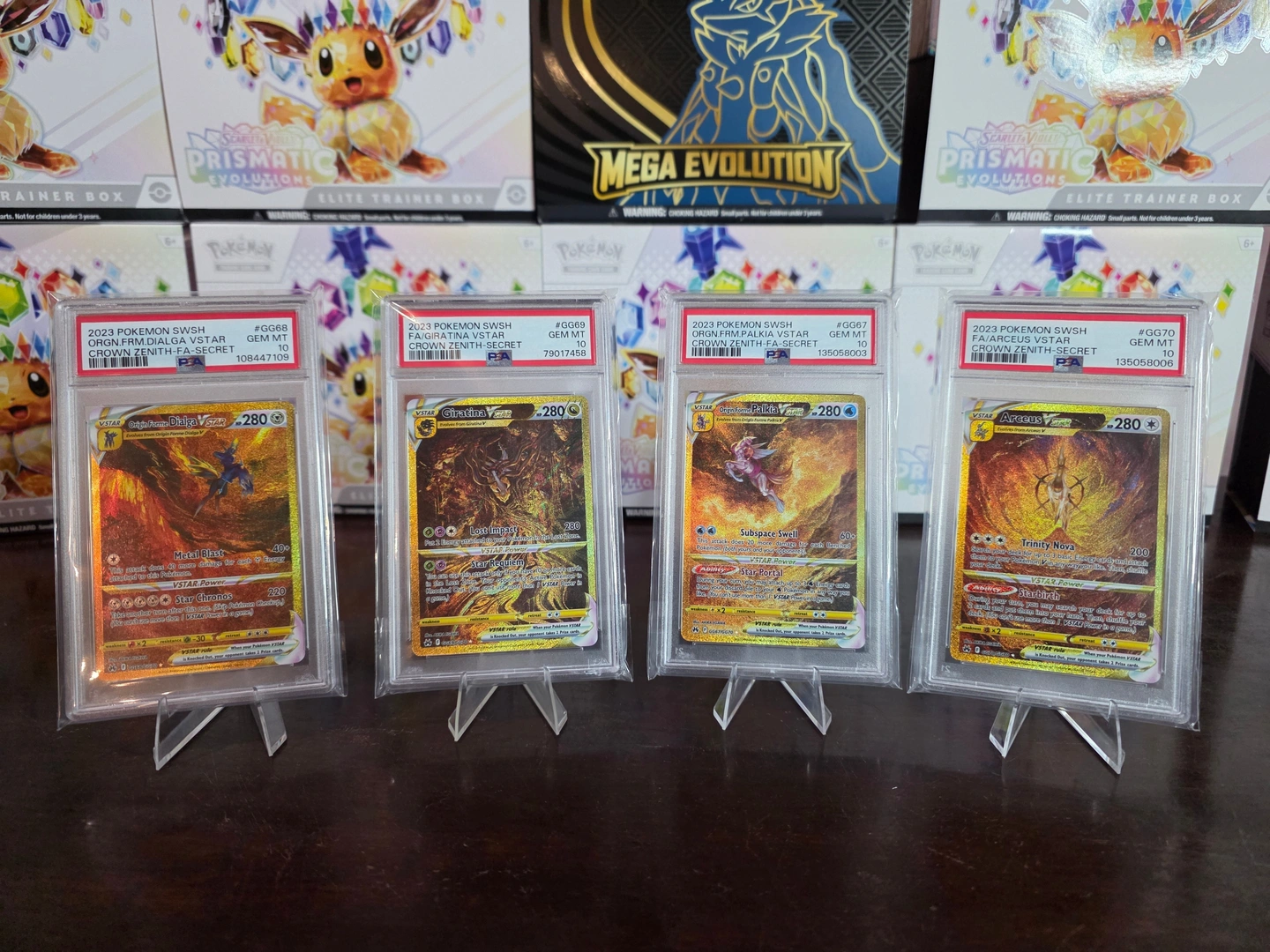 These cards originate from the highly popular Crown Zenith set, one of the most collectible modern Pokémon releases. The Gold VSTAR cards are considered the chase cards of the set, and having all four in PSA 10 condition is extremely difficult due to PSA’s strict grading standards (centering, corners, edges, surface).