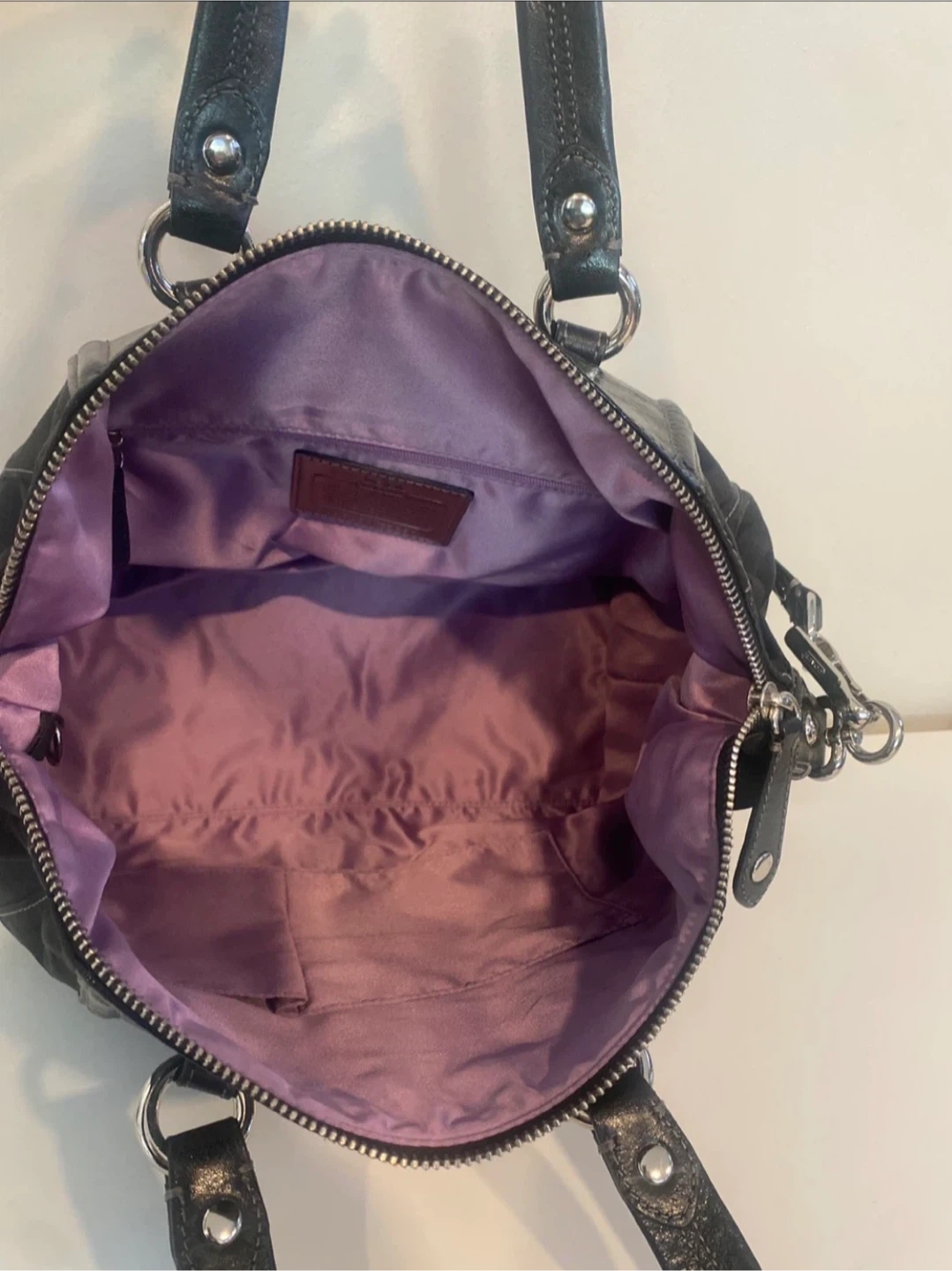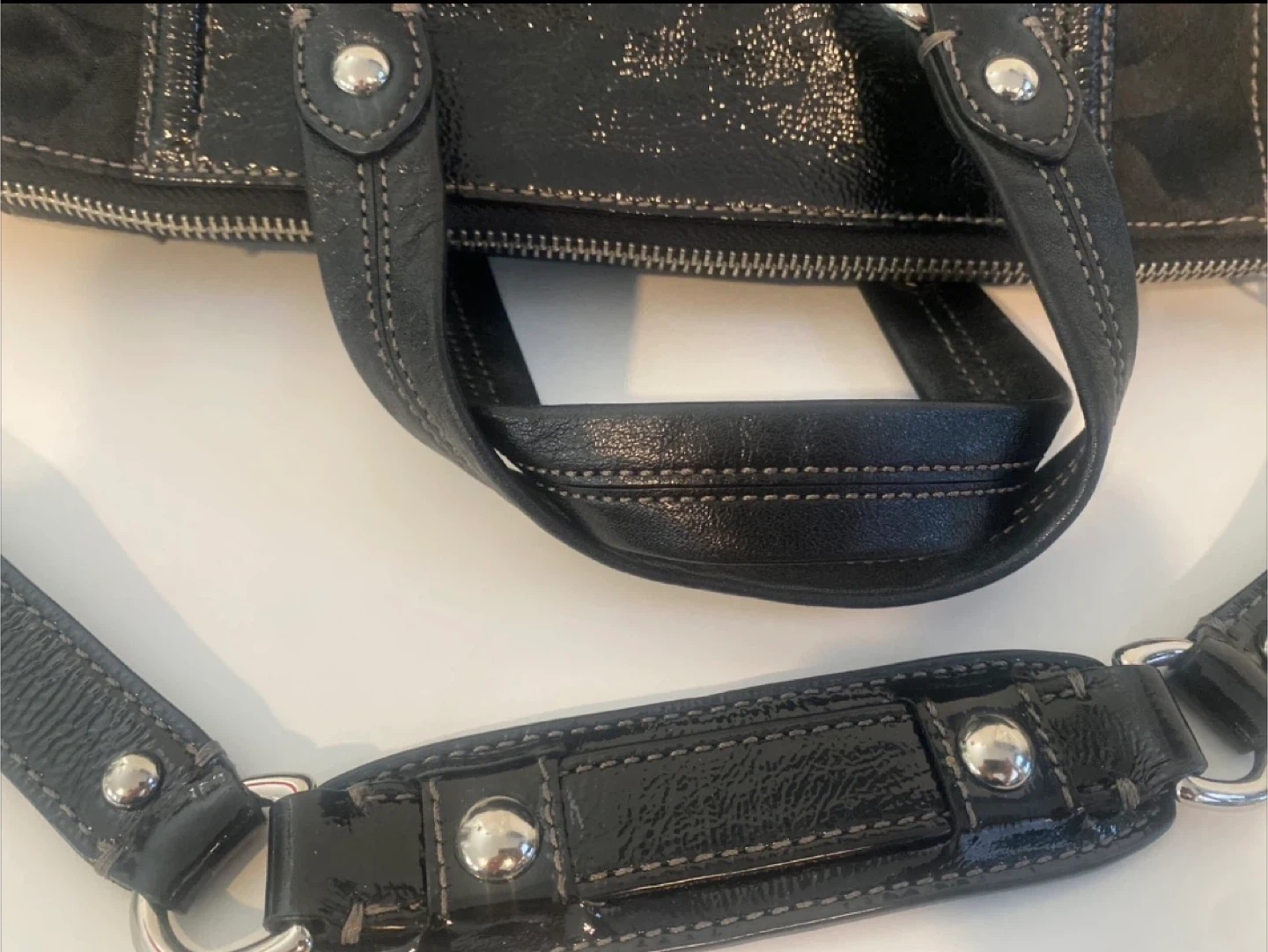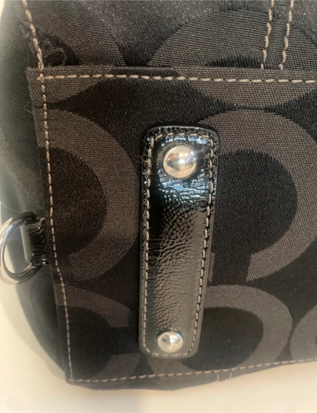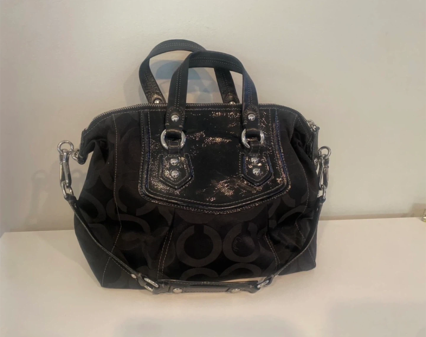 This is a black Coach Purse with the signature C monogram pattern. It features patent leather trim and silver-tone hardware. It has both top handles and a detachable shoulder strap for versatility.
