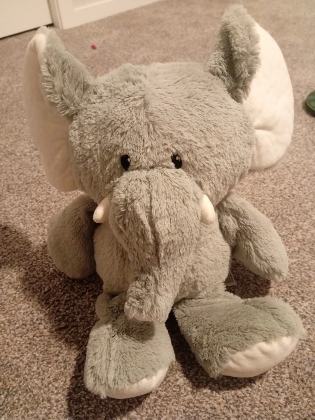 This is a soft, grey elephant plush toy. It's made of fuzzy material and has big, floppy ears. It's a cute and cuddly stuffed animal, perfect for snuggles!