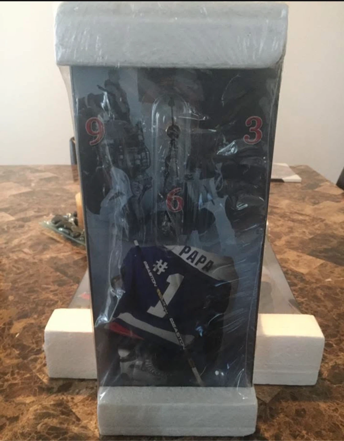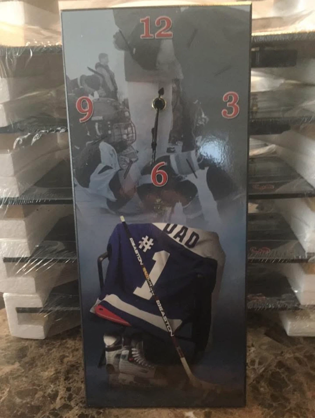 This wall clock features a hockey theme with images of players and a jersey. It's designed to add a touch of sports flair to any room. The clock is new and comes in its original packaging. # 1 Dad or #1 Papa