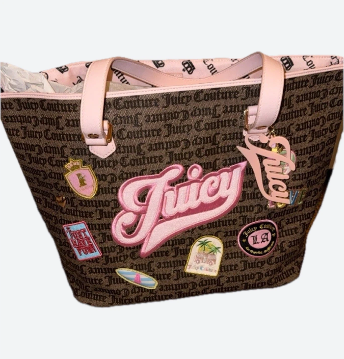 This is a Juicy Couture tote bag with a brown all-over signature logo print. It features pink accents and various decorative patches and a 'Juicy' charm. It's a stylish accessory for everyday use.