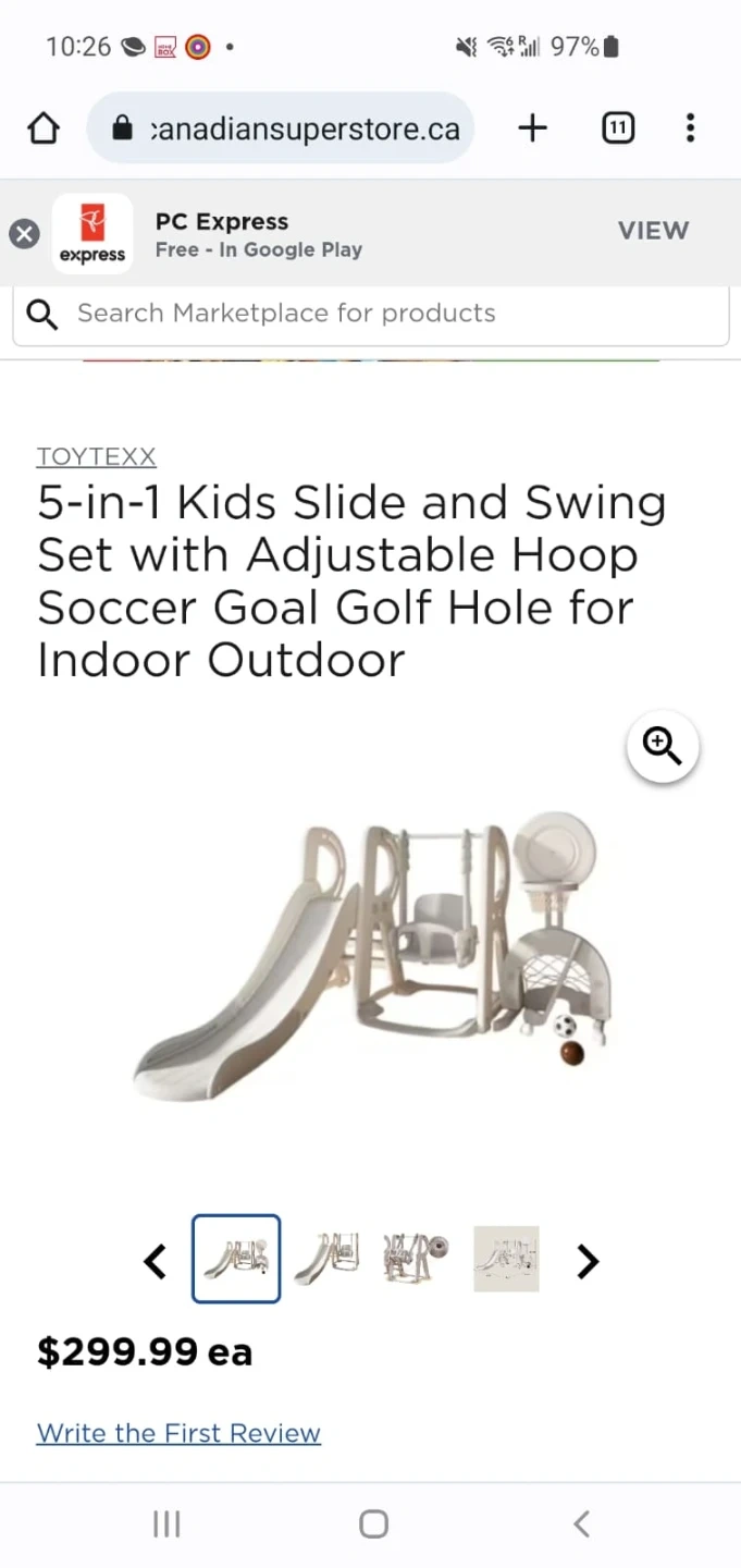 This is a TOYTEXX 5-in-1 kids slide and swing set. It includes a basketball hoop and soccer goal, along with a golf hole. It's suitable for indoor or outdoor use and comes in a neutral beige colour.