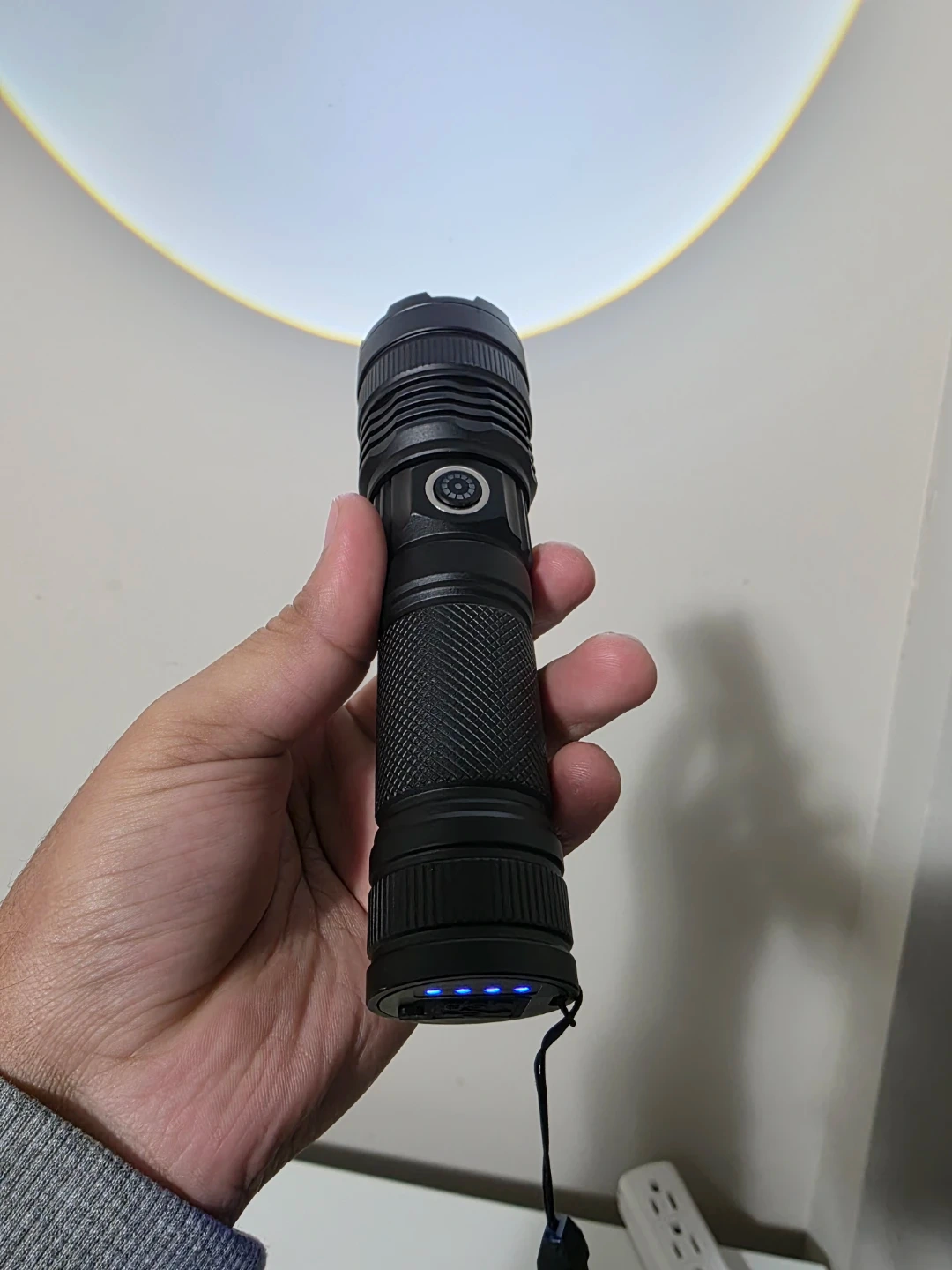 This is a black LED flashlight. It has a textured grip for secure handling. The base shows four blue indicator lights, likely for battery status. It's a handy tool for various lighting needs!