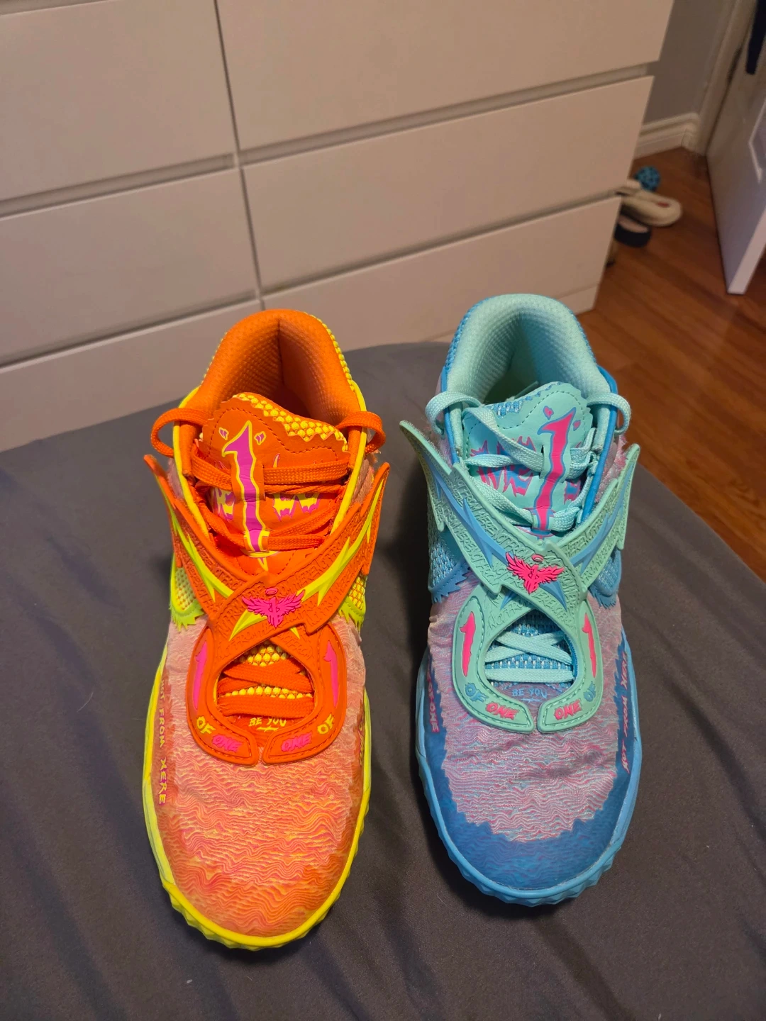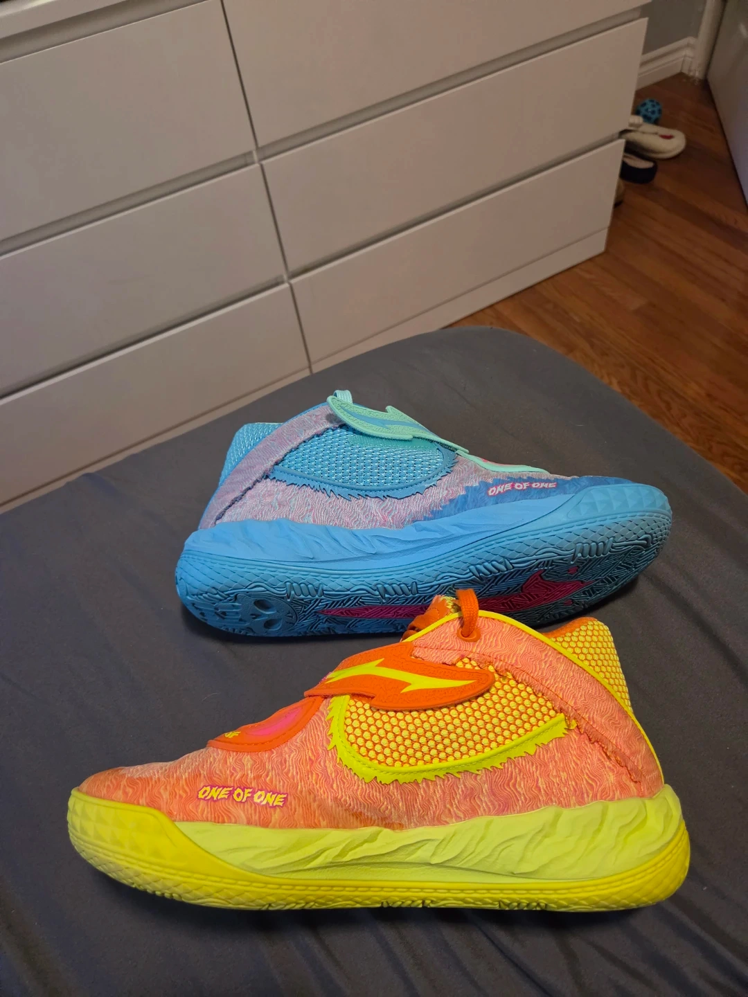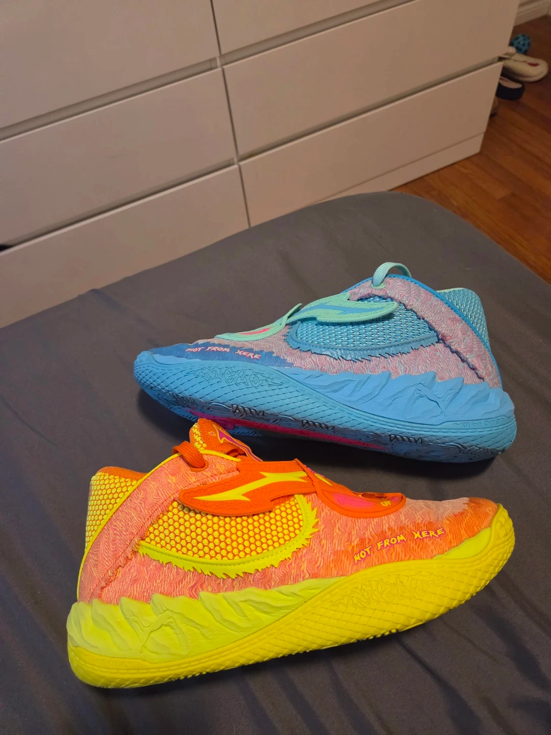These are the Puma MB.01 Rick and Morty "Melo" basketball shoes in a size 10. They feature a vibrant colourway with designs inspired by the show. Comes with the original box.