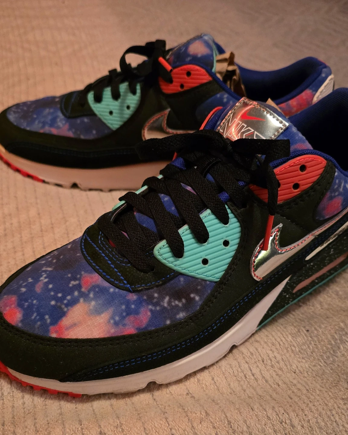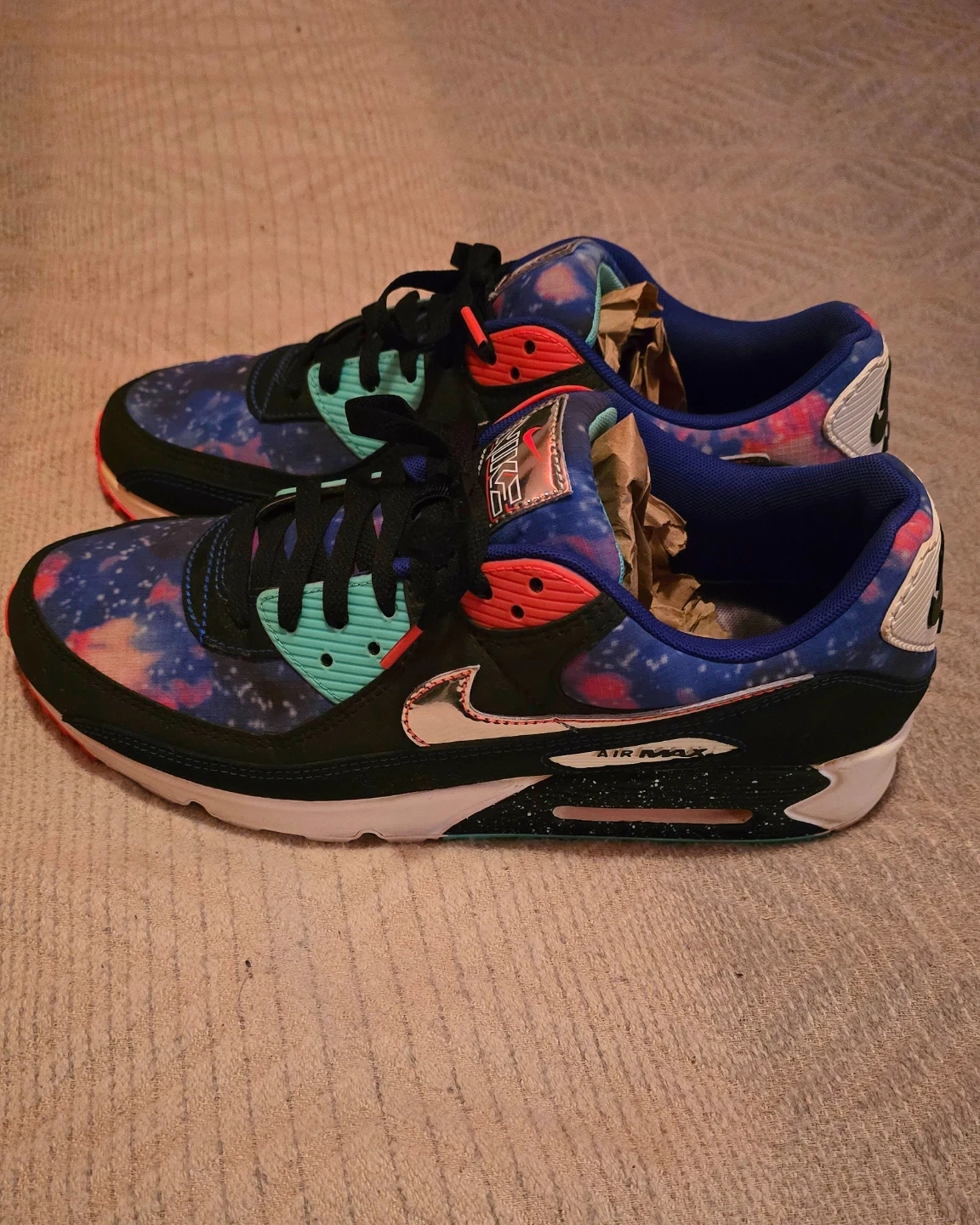 These Nike Air Max 90 shoes come in a "Supernova" colourway from 2020. They feature a blend of blue, red, and teal accents with a space-inspired pattern. Size US Men's 11.