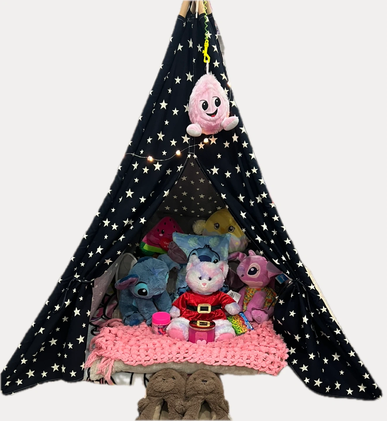 This fun play tent features a black fabric with white stars and includes string lights inside. It comes with several plush toys, including Stitch and other characters, along with a pink fuzzy blanket and slippers. It's perfect for a child's playroom or bedroom!