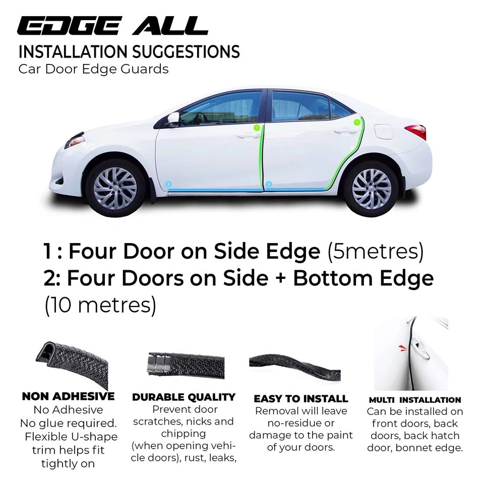 Protect your vehicles from scratches, nicks, and chips with these industrial-grade edge guards! They provide a robust defense against daily wear and tear. Perfect for cars, but versatile enough for boats, fans, and sharp edges. Invest in the longevity of your vehicles. Suitable for all car door edges and motor vehicles. Also used on boat trims, and industrial fans to prevent scratching. Size: 5M/13FT, Thickness: 2MM. Features: Waterproof, Noise Reduction, Dust Blocking, Eco-friendly, Non-Toxic High-Quality EPDM Rubber, High temperature & Corrosion resistance, UV resistance. Protects against door scratches, chipping, rust, leaks, gaps, and vibration. Universal tight fit prevents leakage of air conditioner and blocks the entry of dust, air, and rain. Easy installation and removal with a flexible u-shape rubber that installs directly on the edge trim without adhesive. Use a rubber mallet for a better fit. Removal leaves no residue or damage to paint. Note: The end clips exposed at both ends need to be pulled out before use.