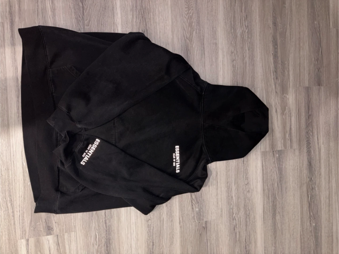 Black hoodie from Fear of God ESSENTIALS. It's made of a comfortable material, perfect for everyday wear. Features ESSENTIALS logo on the sleeve.