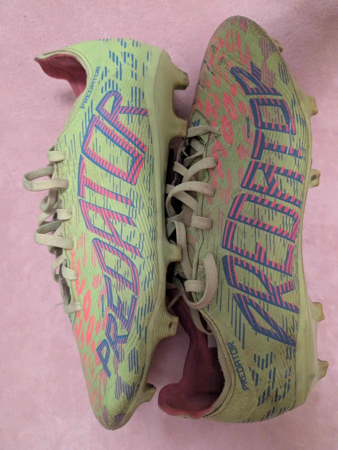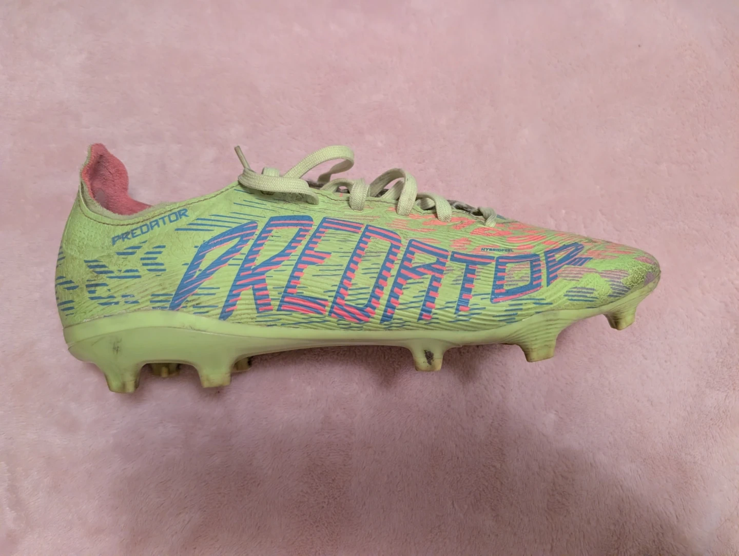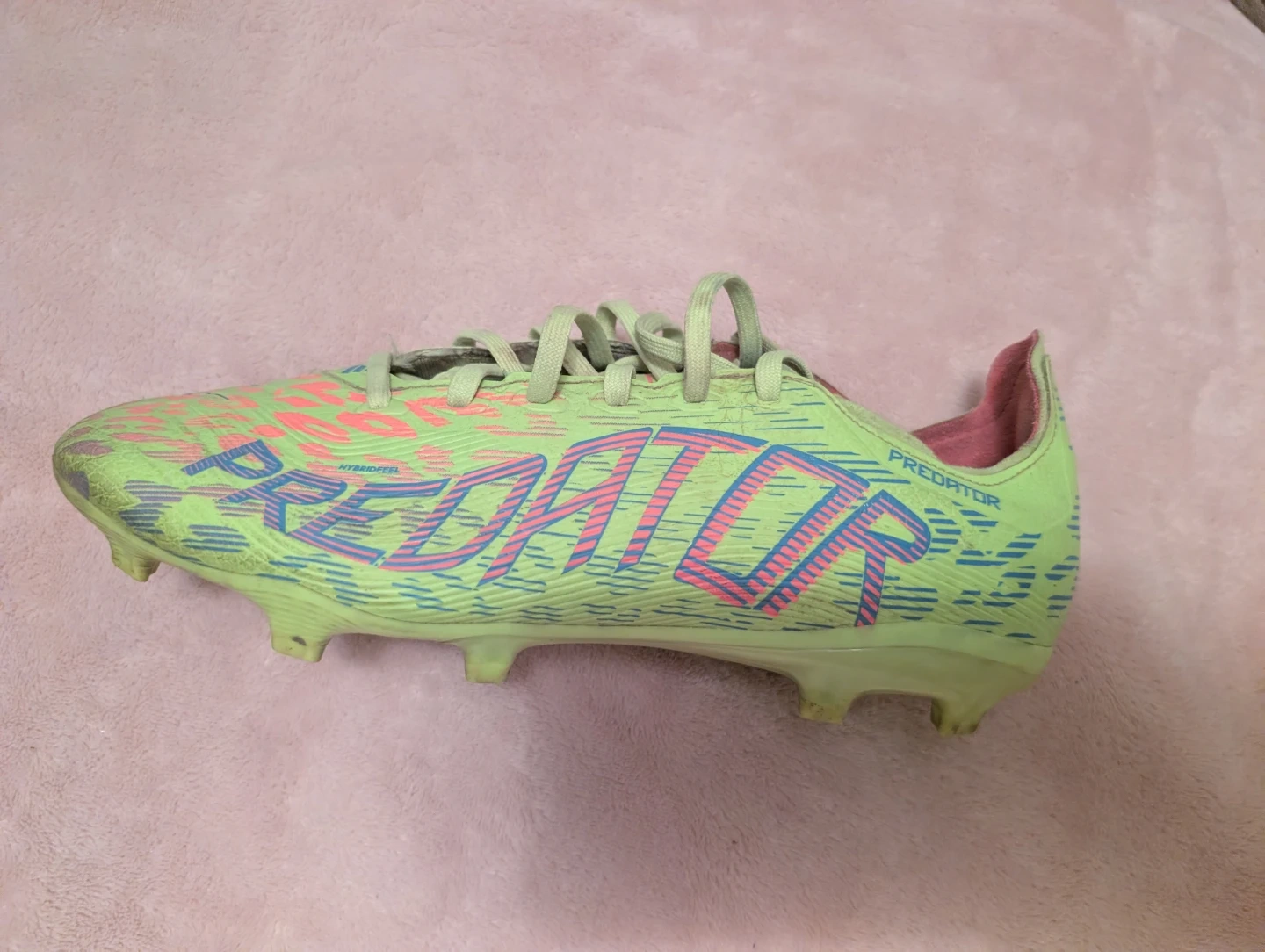 Adidas Predator soccer cleats league in a neon green and pink colourway.Size 7.5 comes with box These cleats are designed for firm ground play.Used but I will clean them