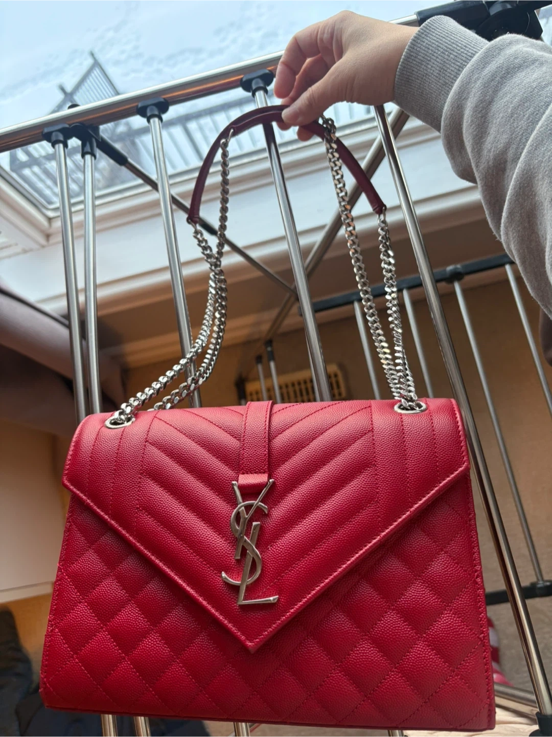 This is a Saint Laurent envelope bag in red quilted leather. It features the iconic YSL logo closure. The bag has a chain strap and is made of pebbled leather.