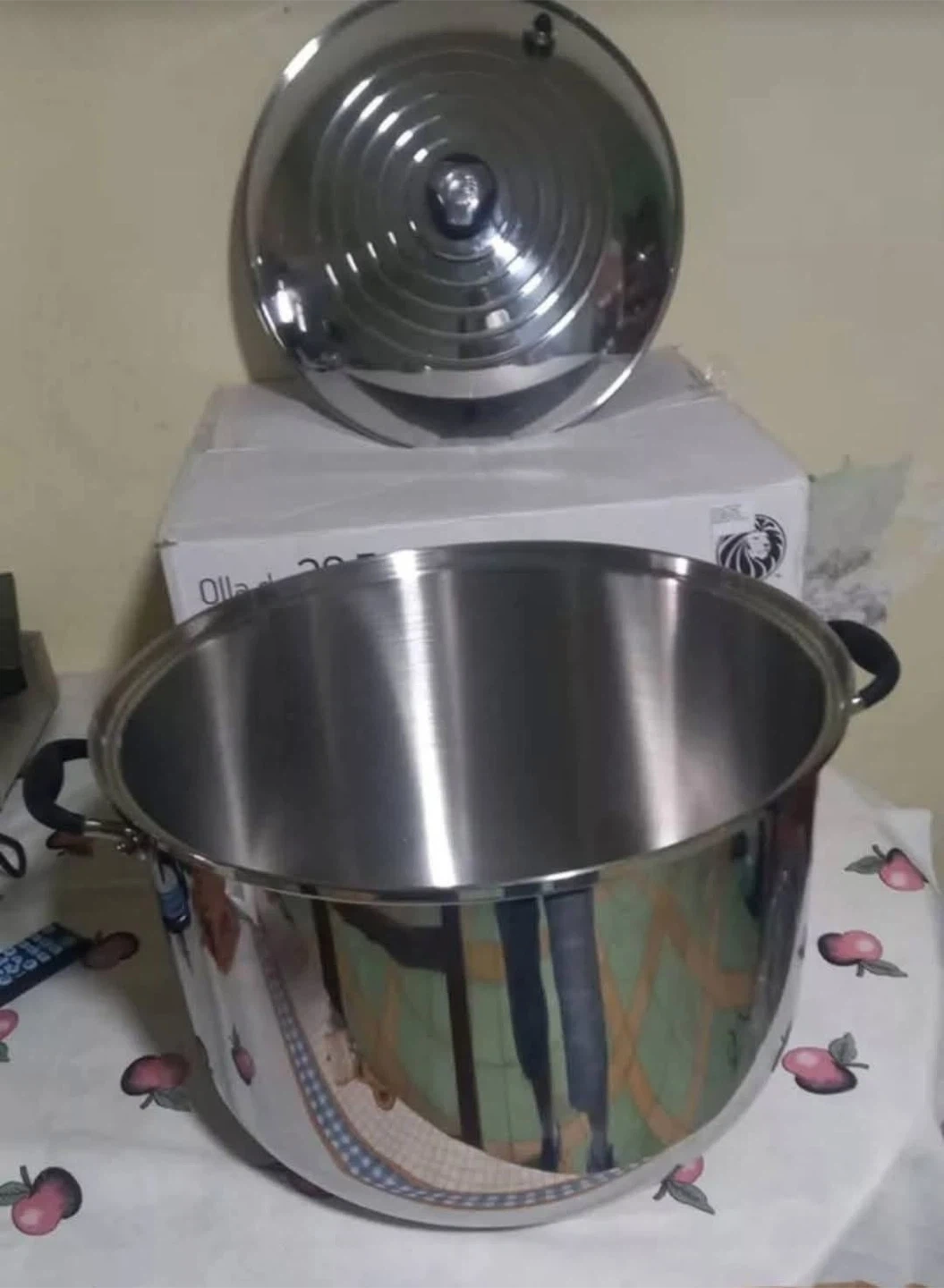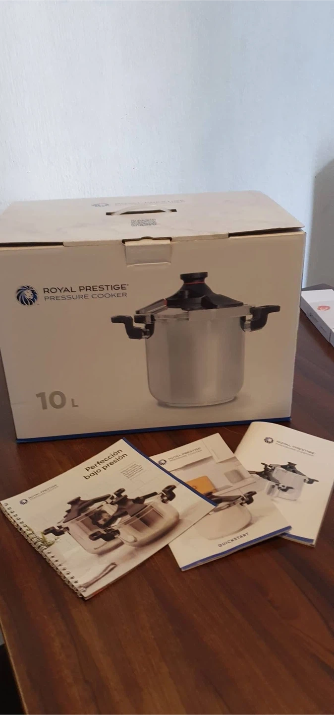 This is a Royal Prestige 10L pressure cooker. It's made of stainless steel and includes product manuals. Its large capacity is great for family meals! Olla de Precion Royal prestige , es Nuba en su caja nunca usado