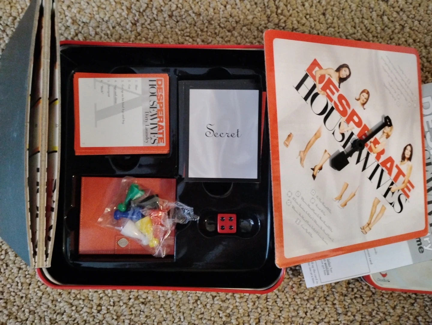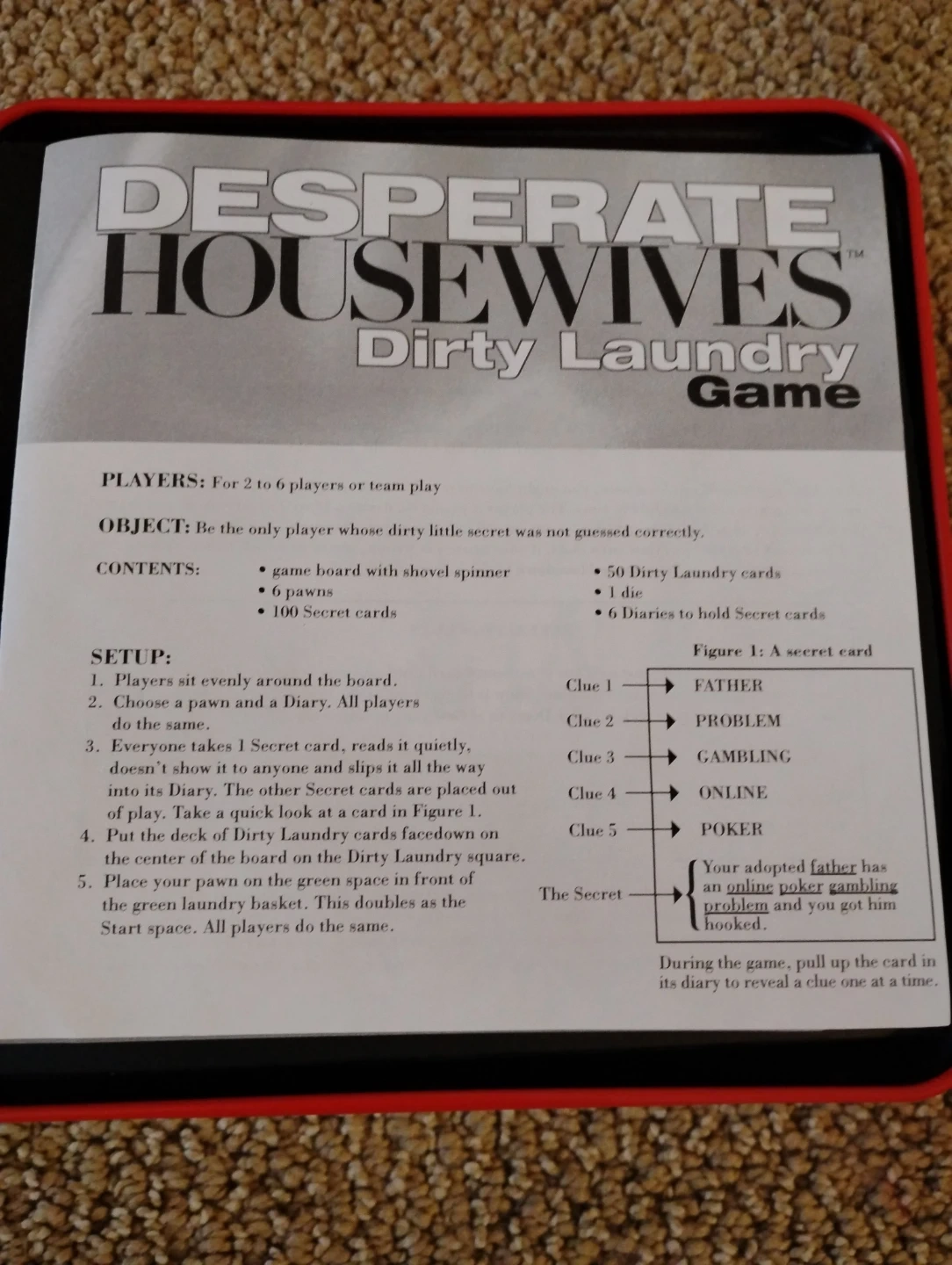 Selling the Desperate Housewives Dirty Laundry Game! It's for 2 to 6 players, or team play, and is recommended for ages 12 and up. The object of the game is to be the only player whose dirty little secret was not guessed correctly. Included are: game board with shovel spinner, 1 die, 6 pawns, 50 Dirty Laundry cards, 100 Secret cards, and 6 Diaries to hold Secret cards