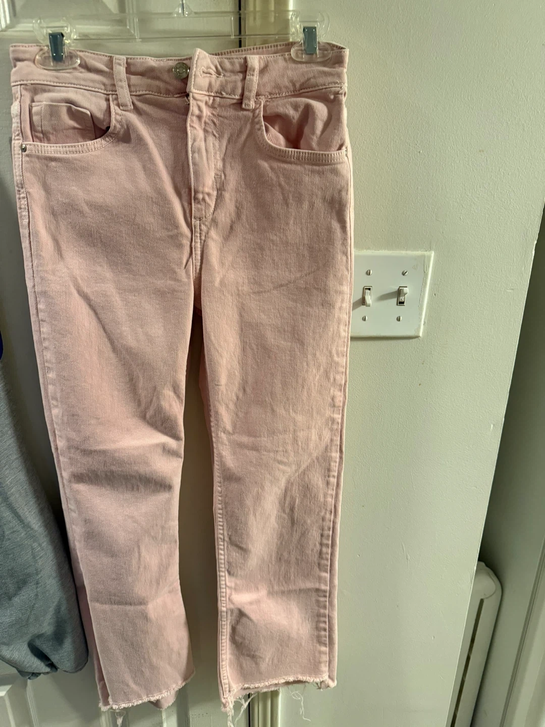 This bundle includes a variety of women's pants. There are black high-waisted button-fly jeans. Also included are pink cropped denim jeans with a frayed hem. A pair of white linen drawstring pants is also in the bundle. Finally, two pairs of grey sweatpants are included, one with '30' printed on the leg. These are great for casual wear or lounging!