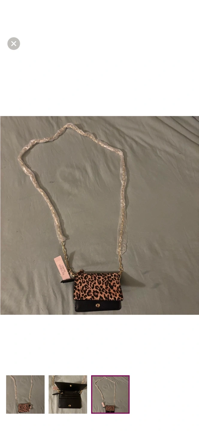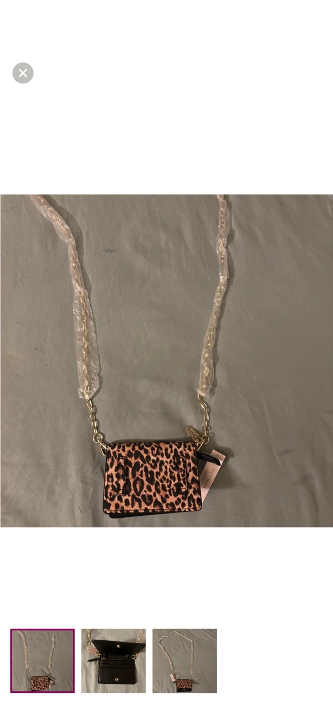 This is a Victoria's Secret mini crossbody bag with a leopard print design. It features a gold chain strap. Perfect for carrying essentials!