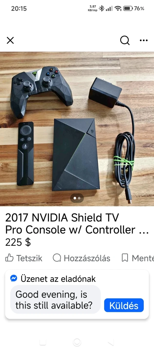 NVIDIA Shield TV Pro Console with controller and power adapter. This unit is black and has a distinctive angular design. It's a great device for streaming and gaming.